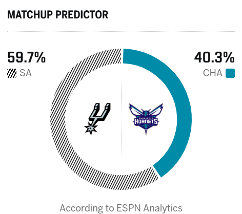 ESPN预测明日比赛:马刺胜率59.7%,黄蜂胜率40.3%