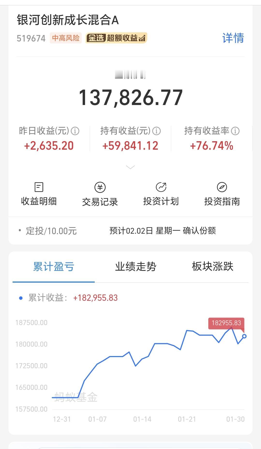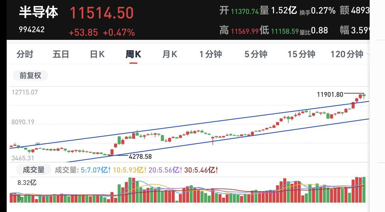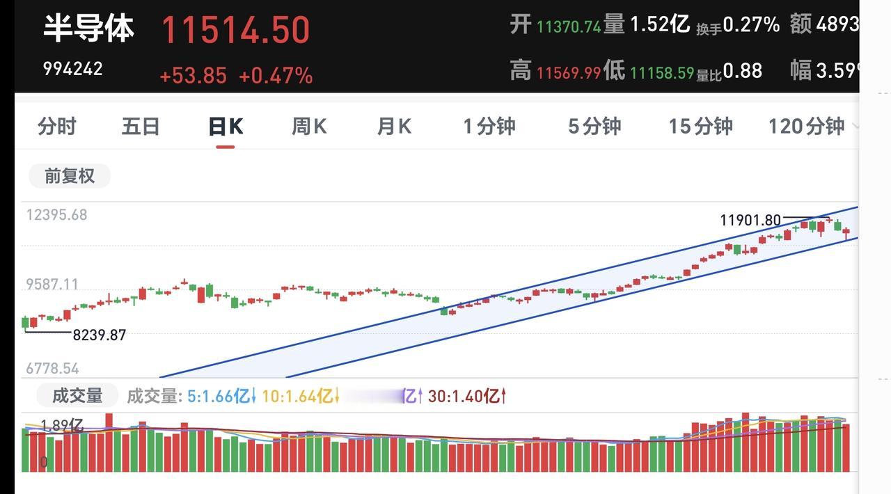 基金:半导体板块应该怎么办 持有的芯片半导体板块基金银河周五大涨,净值更新上涨了1.95%,大幅度超过了板块0.77%的上涨幅度,这个板块的持有人数在所有板块当中排名第3位,最近的散户人数有所减少,前段时间这只基金的持有人数排名第一。 看下面的截图4,这是半导体板块日K线图,现在的位置处于这个上涨通道中,周五盘中回落的最低点,正好打到了这个上涨通道的下轨线上,遇线反弹是意料之中的事情,遇线反弹是大概率的事件,短线持有的人可以继续持有,这个上涨通道的下轨线,是短线持有者的持有条件。 看下面的截图5,这是半导体板块周K线图,前段时间上涨突破了上涨通道的上轨线,现在是震荡回落过程中,但还处于上涨通道的上方,即使回到上涨通道内,也还是处于上涨趋势中,长线持有的人可以继续持有,周线级别上涨通道的下轨线,是长线持有者的持有条件。 芯片半导体板块基金银河,我持有137826元,持有收益59841元,持有收益率76.74%,累计收益182955元,每天定投10块钱。 这只基金持有金额13万元,累计收益18万元,全部都是利润在里面飞,累计收益已经超过了持有金额5万元,所有这一切,都是因为在低位的时候坚持定投,上涨阶段坚定持有,高位区域落袋为安,如果你能坚持怎么办,你也可以是这样的。 花一秒钟点赞,花30秒钟评论就是对我最大的支持,谢谢支持我的朋友发大财。