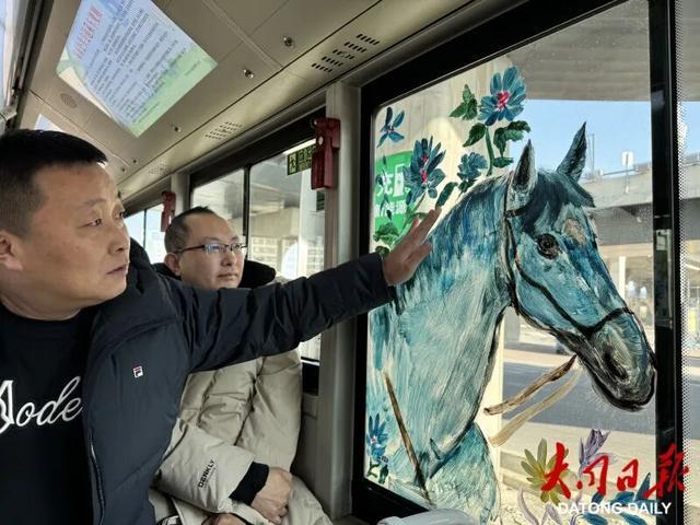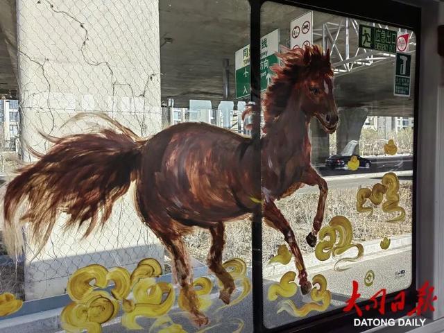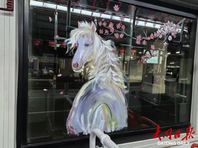 “我们这次车厢焕新主要围绕马年生肖绘画为核心,在全线路14台车上,分别打造了风格不同的彩绘骏马‘年味车厢’。”据该公司相关负责人介绍,这些线条灵动、色彩鲜艳的骏马图案,是一位职工家属倾情奉献、利用3天时间绘制的,有的借鉴了汉代铜奔马“矫健灵动”的姿态,配以祥云纹饰寓意“马到成功”;有的以温情笔触勾勒亲子骏马图景,传递“阖家团圆”的美好期许,将传统生肖文化与公交车窗巧妙融合。
