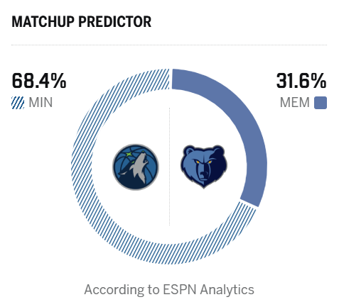 赛前,美媒ESPN预测本场比赛,森林狼胜率68.4%,灰熊胜率31.6%。