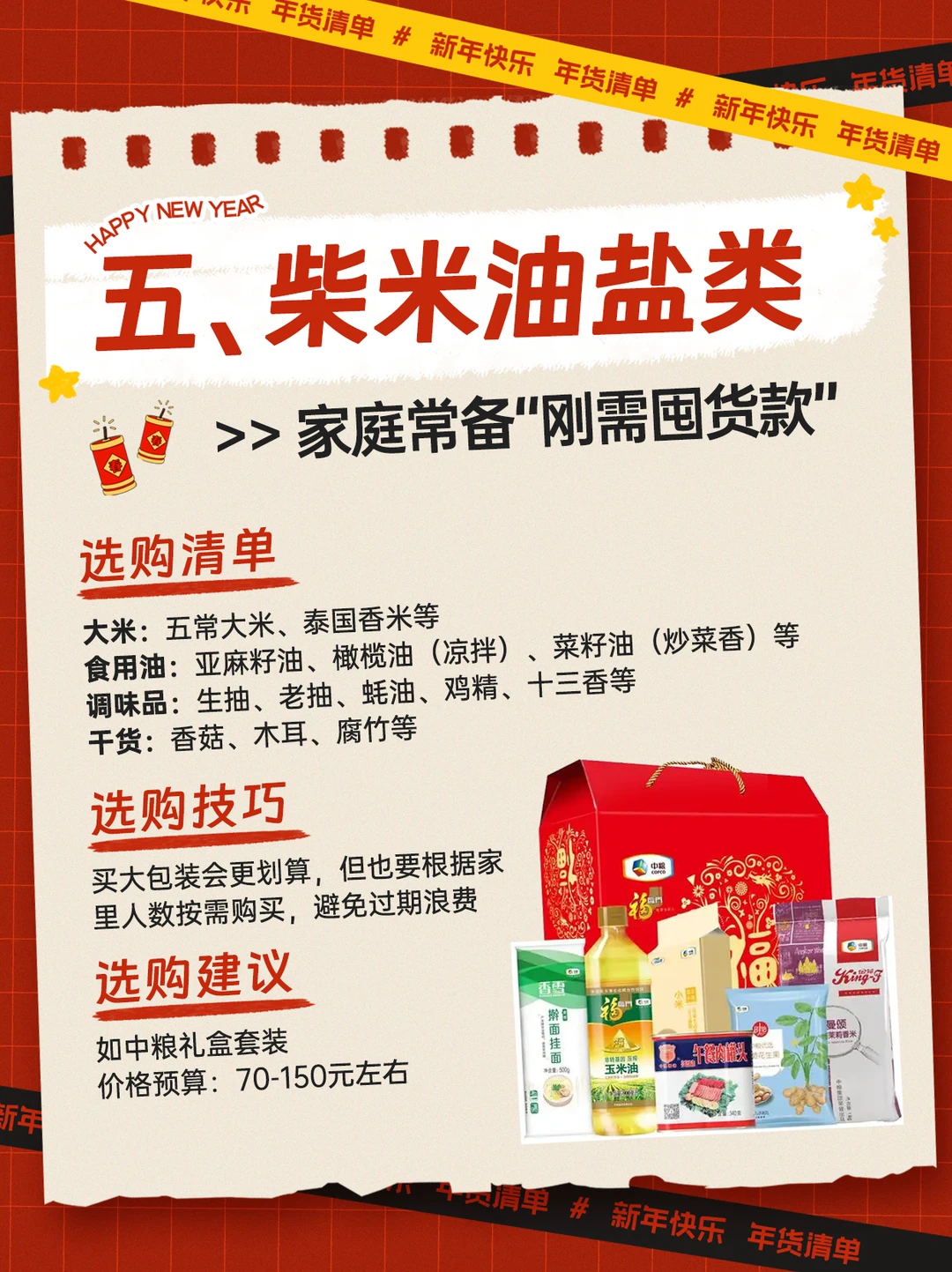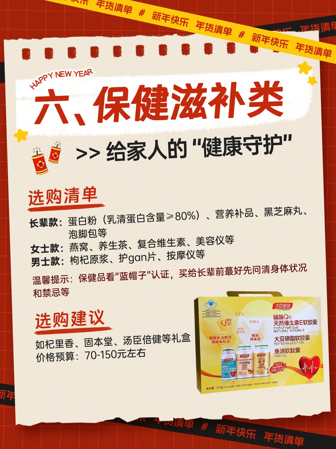 每年蕞愁就是备年货[失望R] 买来买去都是那几样❓ 这份专为注重健康的你 整理的年货清单[斜眼R] 不仅满足味蕾,更呵护身体~ 照着买,保准全家夸[派对R] 年货采购思路,记住这3️⃣点 ✅健康化优先 ✅场景要对位 ✅信任感背书 年货品类可以这么选❗ 1️⃣坚果/零食礼盒类 如开心果、巴旦木、碧根果、核桃等 2️⃣速冻食品类 主食(饺子、汤圆、烧麦等) 硬菜(牛排、佛跳墙、烤肠、酥肉等) 快速早餐(蒸饺、煎饺、手抓饼) 3️⃣糕点零食类 传统糕点(沙琪玛、枣花酥、桃酥、米糕) 网红零食(奶枣、雪花酥、蛋黄酥、曲奇等) 地域特色(北京驴打滚、成都三大炮等) 4️⃣茶叶酒水类 茶(红茶、绿茶、乌龙茶、普洱茶等) 酒水(白酒、红酒、米酒、起泡酒等) 5️⃣柴米油盐类 大米(五常大米、泰国香米等) 食用油(亚麻籽油、橄榄油、菜籽油等) 调味品(老抽、蚝油、鸡精、十三香等) 干货(香菇、木耳、腐竹等) 6️⃣保健滋补类 送长辈(蛋白粉、养生茶、、黑芝麻丸等) 送女士(燕窝、复合维生素、美容仪等) 送男士(枸杞原浆、护gan片、按摩仪等) In the end想说 过年备货蕞重要的是 适合自己和家人的实际需求 不盲目跟风! 愿你在这个春节 吃得开心,[买爆R]得称心,过得舒心[喝奶茶R]~ 温馨提示:文章内容来源网络,仅供参考