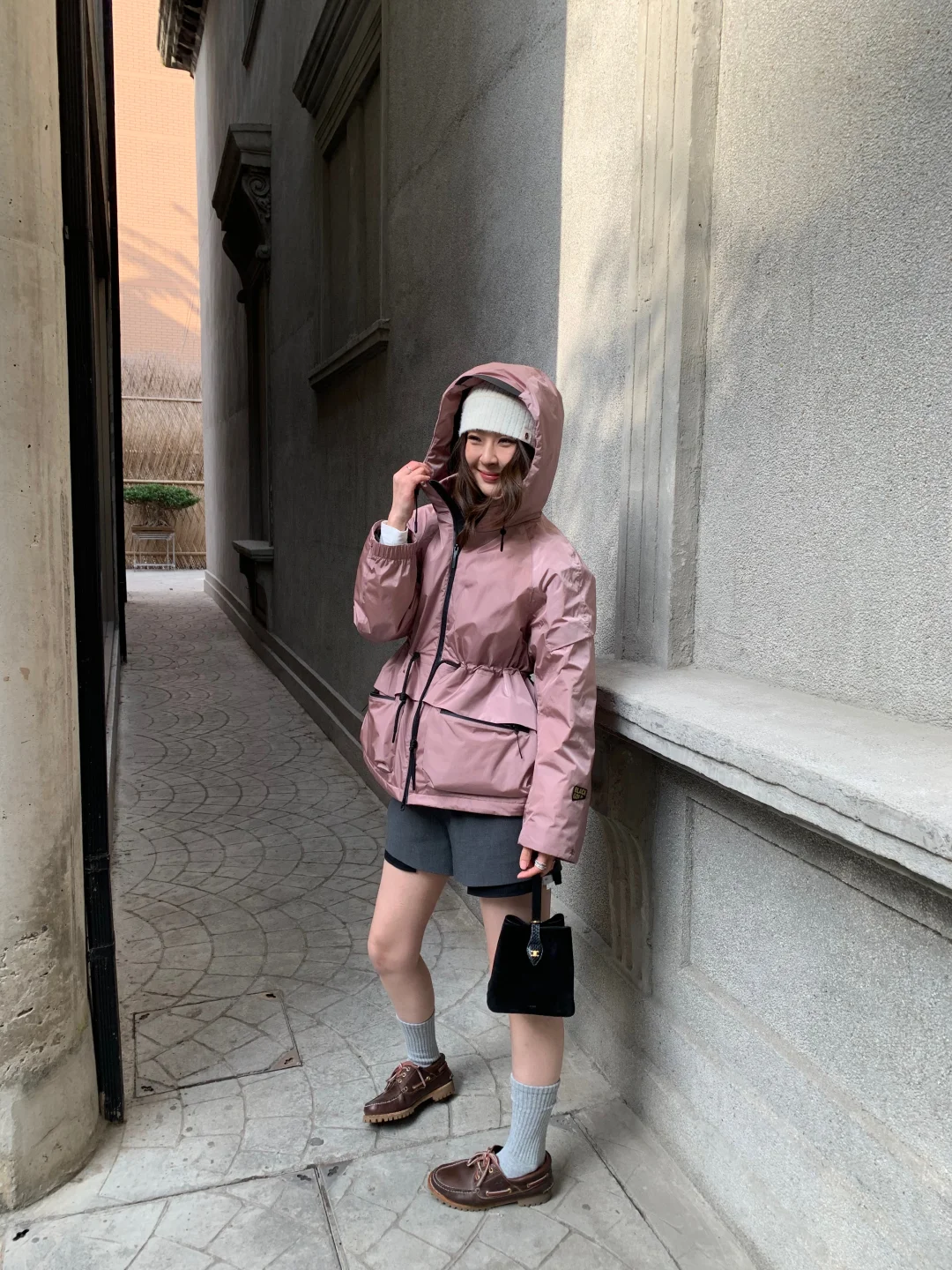 漂亮的周五 用美丽心情迎接周末 冬末的上海阳光很柔 照在身上暖暖的 又怕早晚的温差“偷袭” 于是穿上高梵轻壳鹅绒服轻便迎春 玫瑰金色调温柔又带些俏皮,内搭白色针织衫与短裤 系上一条细腰带,衬出身形线条 袖口经典的黑金标志,为造型添上几分精致感。 整体保暖而不厚重,腰侧的手拉绳只需一拉一推,就能勾勒出沙漏般的腰身,视觉上更显修长 90%绒子含量、700+蓬松度,带来轻盈蓬松的穿着感受,仿佛裹着云朵般舒适 不妨也选一件轻壳鹅绒服,温柔应对换季温差,点亮你的春日心情吧