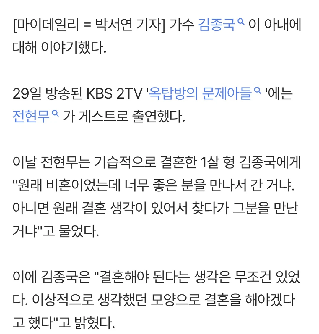 对此金钟国表示:"我绝对有结婚的想法。 我说过我必须和我理想中的人结婚。"。