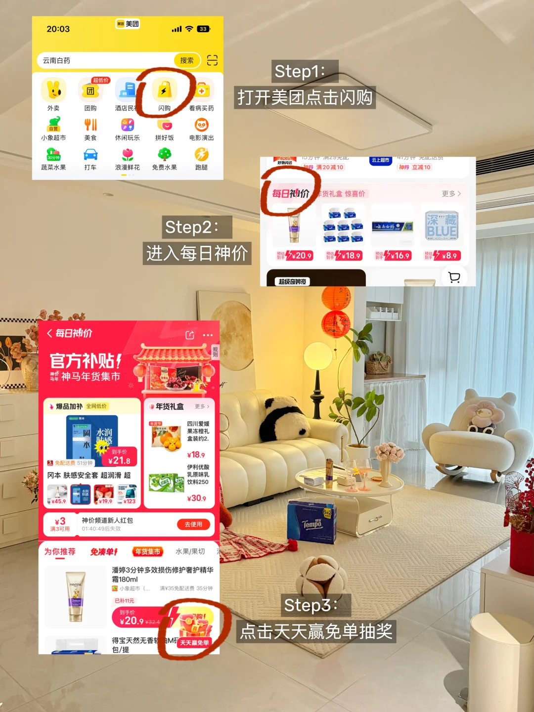 1:打开美团App,点击【闪购】,戳每日神价,就能看到超多神价好物啦!进频道页点“天天赢免单”还能参与免单活动!