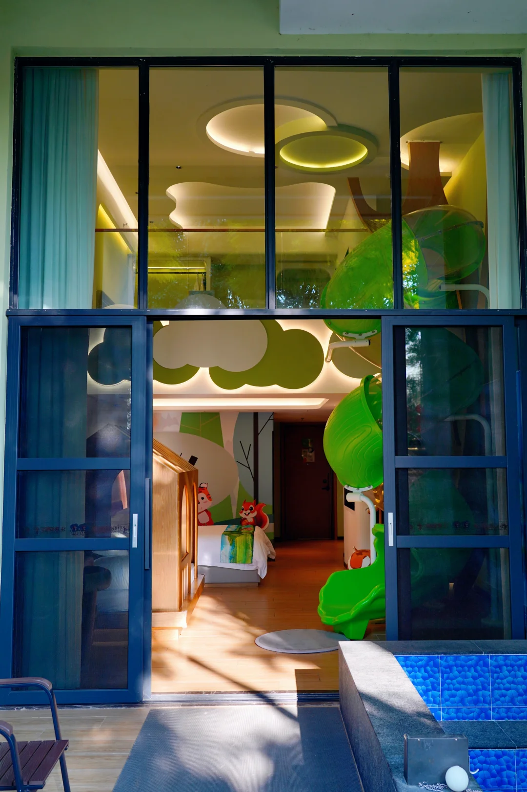 童趣满满的主题房里竟然有滑滑梯,就像一个小型游乐园,三床两卫的亲子LOFT房还带私汤温泉,度假感拉满💯