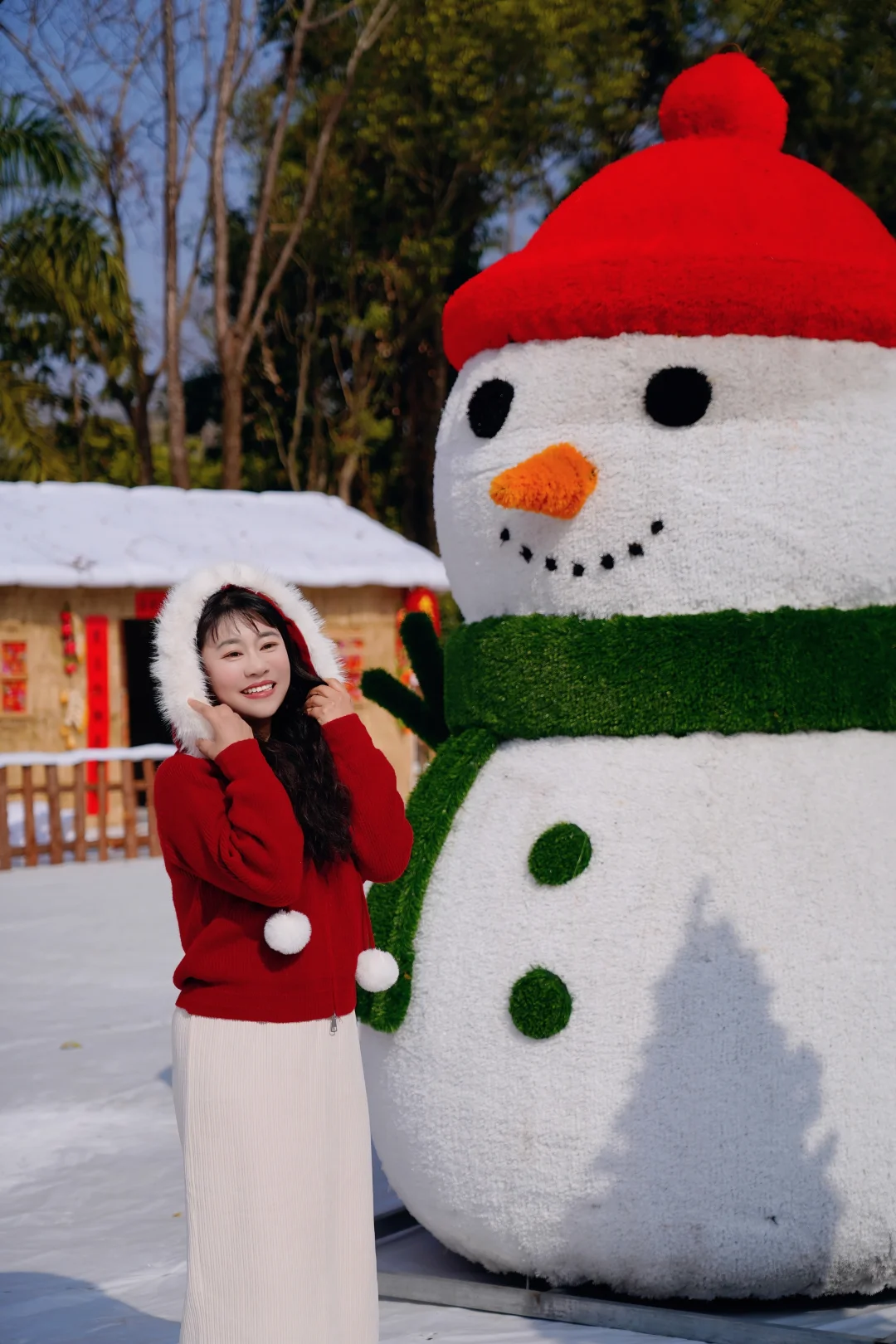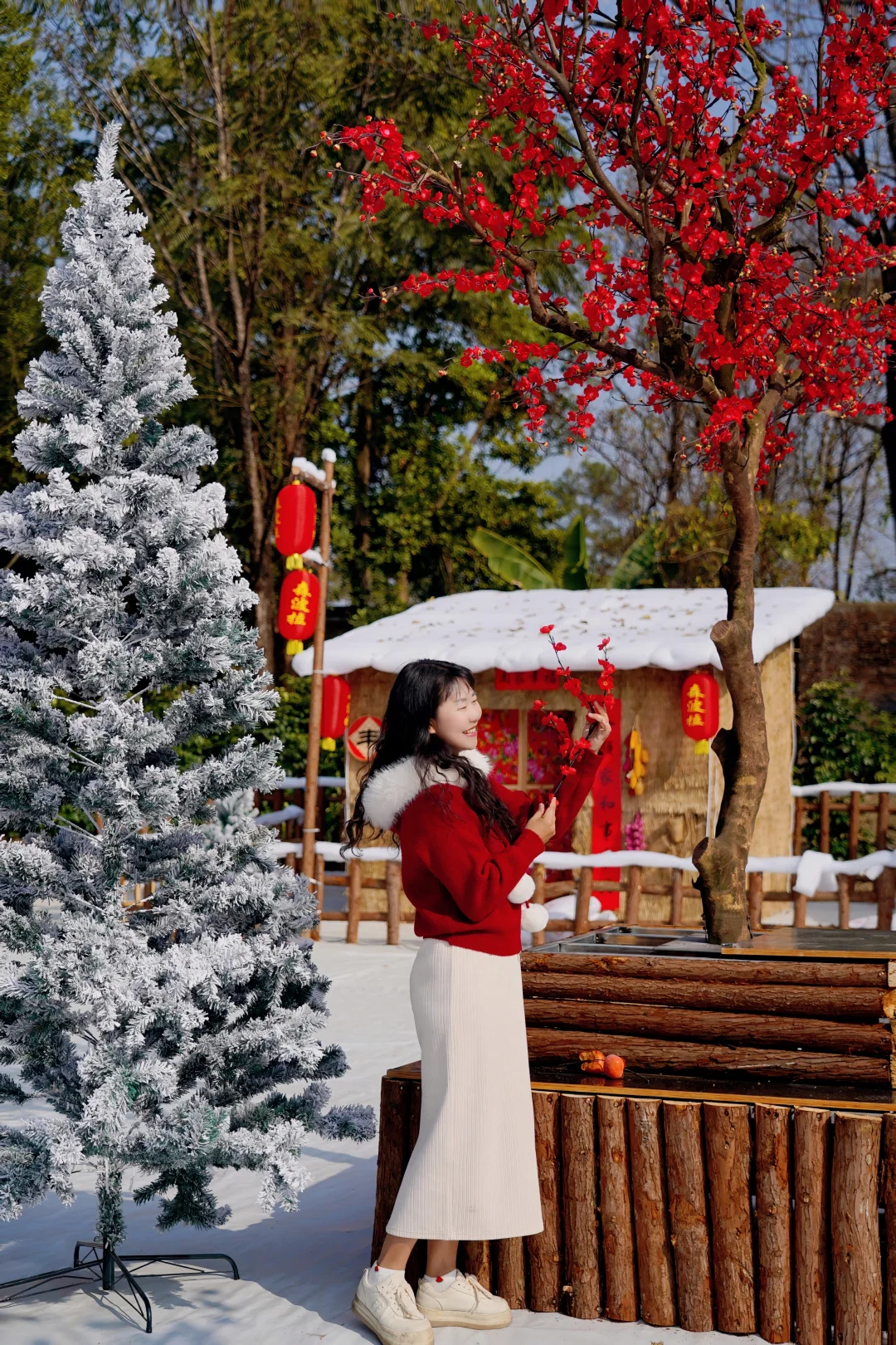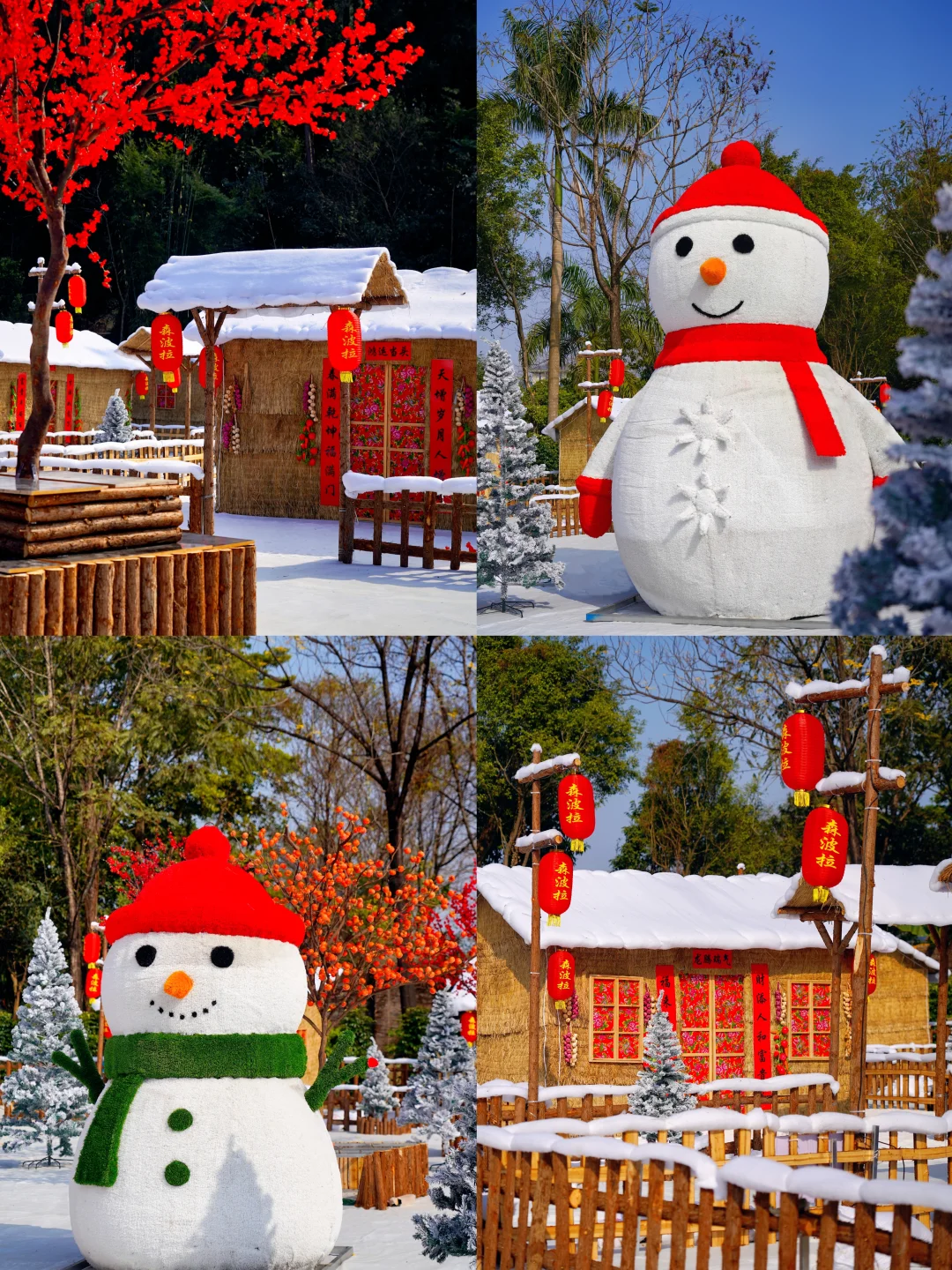 原木小屋覆着皑皑雪絮,红红的灯笼在檐下轻摇,可爱的雪人藏在农家小院里,窗边一串辣椒玉米,透出暖融融的烟火气。不用远行,这里就有一个南国童话雪乡