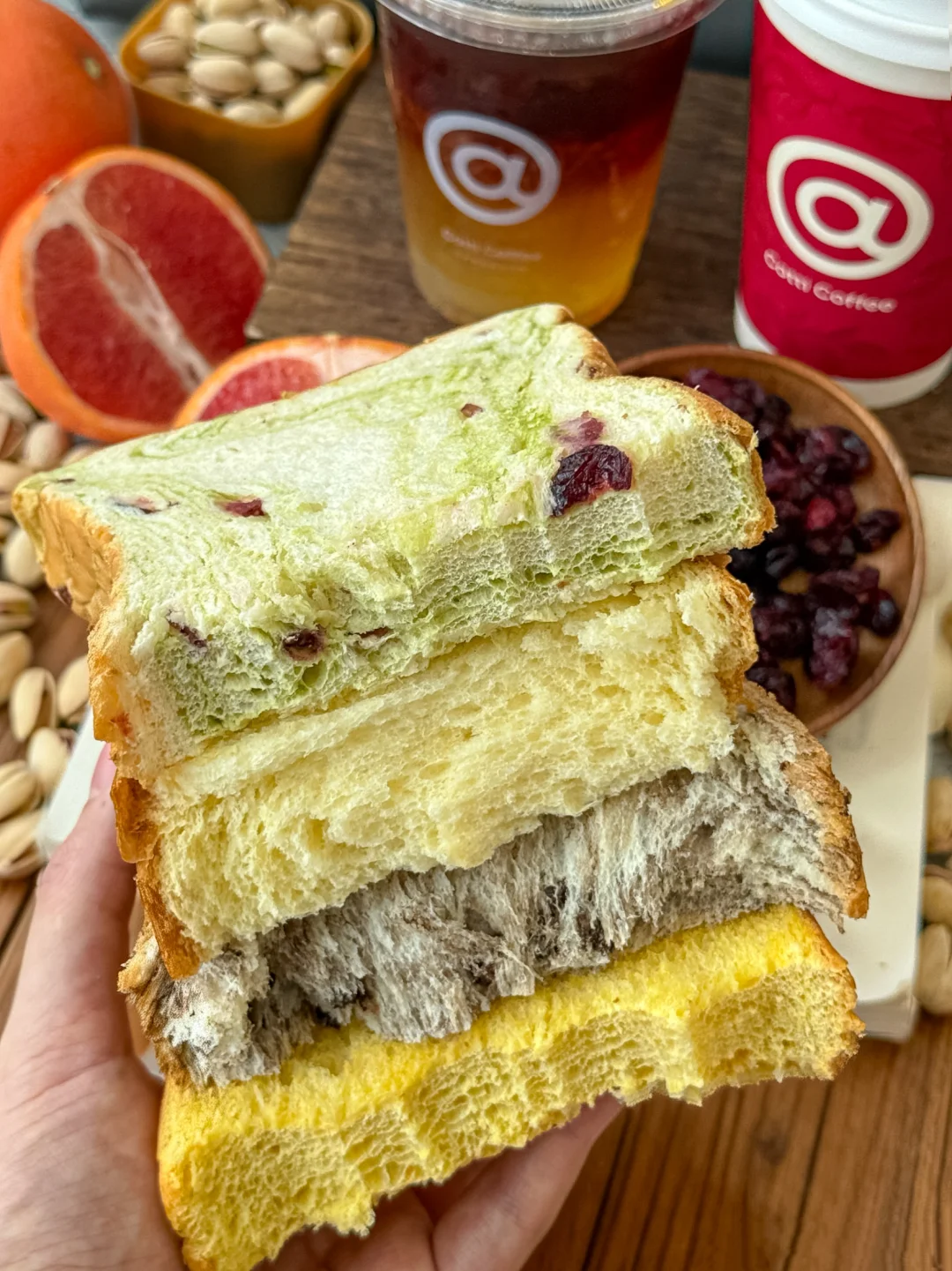 一周至少五天的早餐都是库迪。。 新出的双柚美式真的超好喝了!! ✔️冷饮喝得出IIAC⾦奖咖啡的香醇~ 加了酸酸甜甜的⽩西柚果汁超级清爽解腻!! 还能喝到红西柚果粒 ✔️热饮的咖啡香果香会更浓郁~ 这个春节不是可以在家边享受美食边无负担的喝上了 买咖啡的时候顺便买了🍞开心果蔓越莓小方砖! 松软绵密有韧劲又很有嚼劲 酸酸甜甜的蔓越莓丁搭配巨浓郁的开心果酱!我将直接给到夯!! 还有南瓜橙皮小方砖、牛乳厚切小方砖、熔岩黑巧小方砖都完全好吃!!