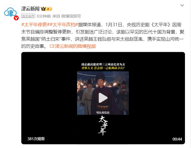 据媒体报道,1月31日,央视历史剧《太平年》因周末节目编排调整暂停更新,引发剧迷广泛讨论,该剧以罕见的五代十国为背景,聚焦吴越国“纳土归宋”事件,讲述吴越王钱弘俶与宋太祖赵匡胤,携手实现山河统一的历史故事。