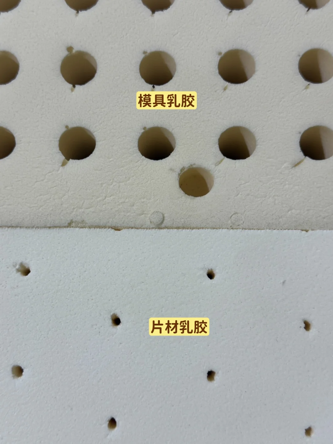 如图片中,图一是横切面孔的区别,模具乳胶的孔是模具自带的,孔圆周是有一层膜,是模具加热棒形成的表皮,下图是片材乳胶,乳胶垫本身没有孔,是后期冲孔,所以孔圆周是没有自然的表皮。 图二是表面,也可以清晰的分辨出是模具一体成型的孔还是成型后在加工的孔,这个是最明显最好分辨的一种方法,模具乳胶优于片材乳胶。这是2种不同的乳胶最好的分辨方法,模具乳胶在细分为天然乳胶和合成乳胶,下次在教大家分辨