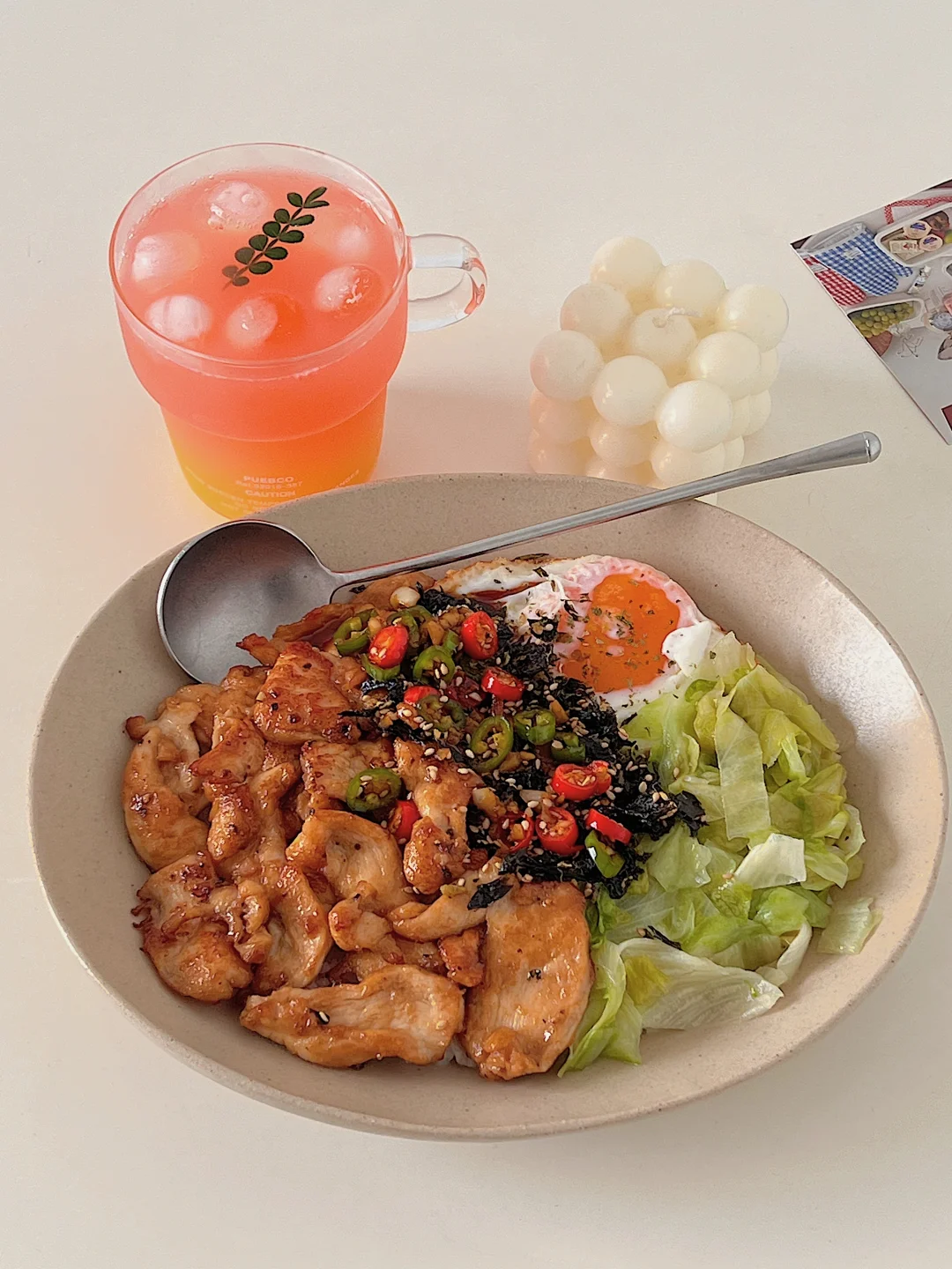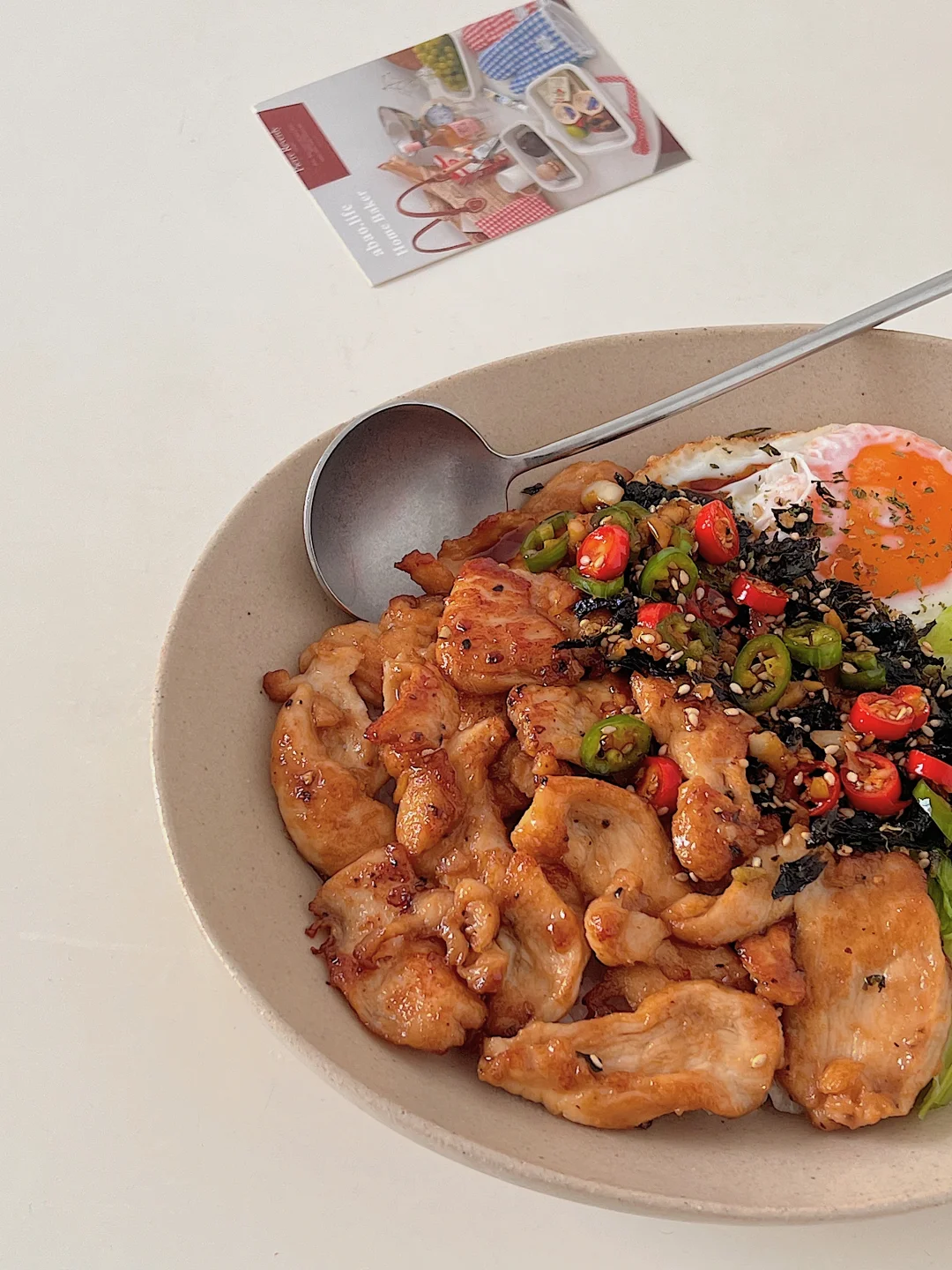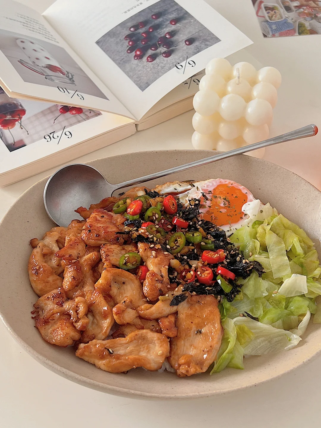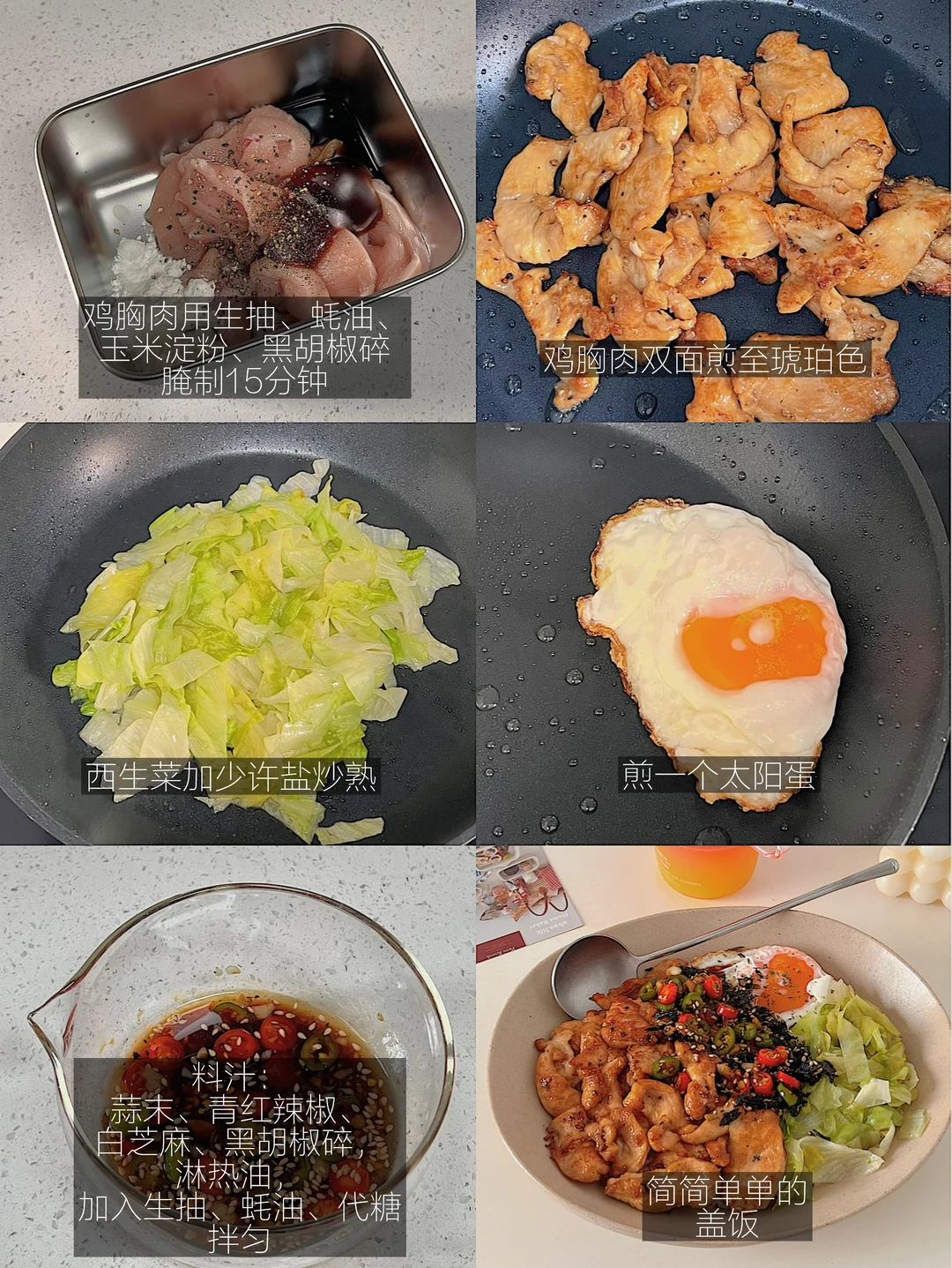 6⃣️ 碗底铺上米饭,码上鸡胸肉、生菜、太阳蛋,淋上料汁!