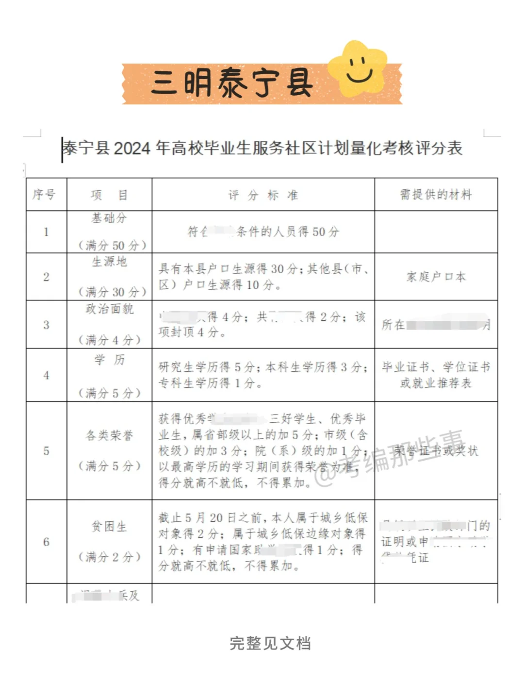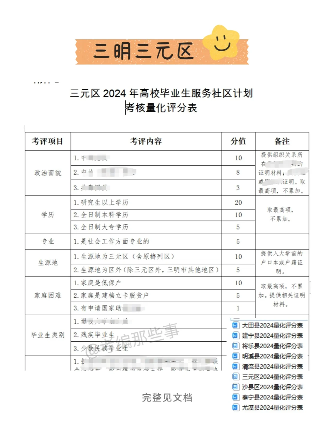 三明高校毕业生服务社区2024年各县量化评分表已出