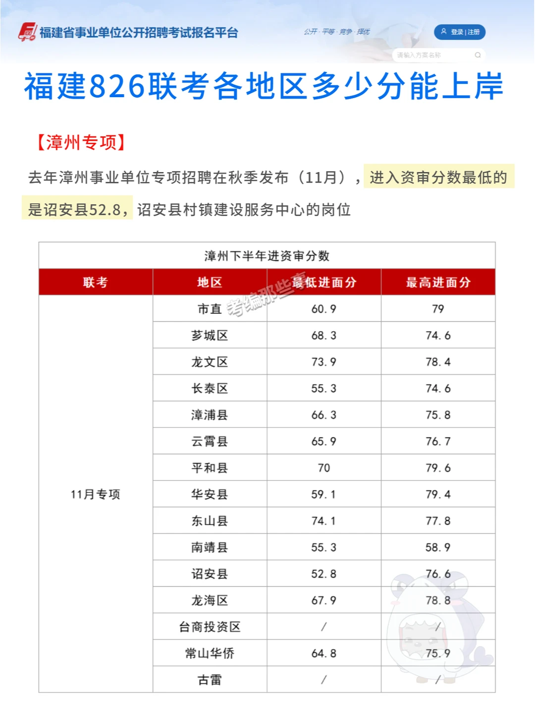 去年漳州事业单位专项在秋季发布(11月),进入资审分数zui低的是诏安县52.8
