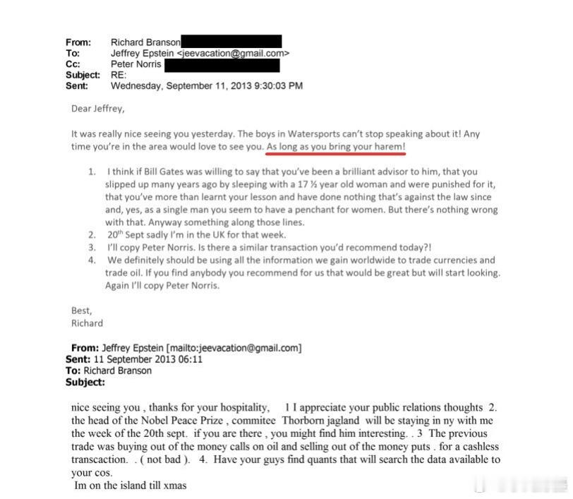 亿万富翁理查德·布兰森曾对爱泼斯坦说:“你只要来这附近,我都非常乐意见你。只要你带上你的后宫佳丽!”热点现场黄媒不会说的真相