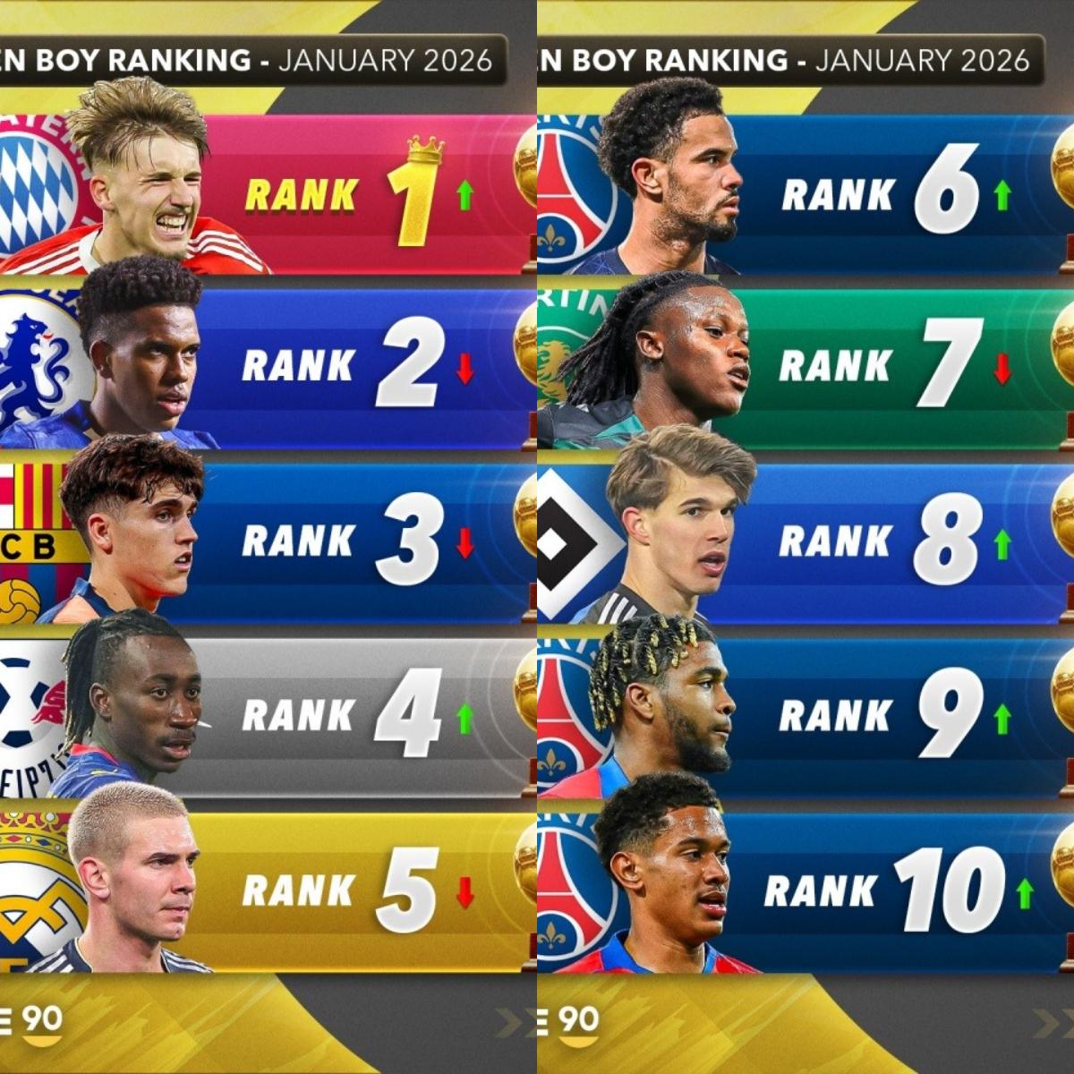 虎扑02月01日讯Score90列出2026年金童奖最新排名预测,拜仁攻击手卡尔居首,切尔西的埃斯特旺和巴萨的库巴西分列二三。