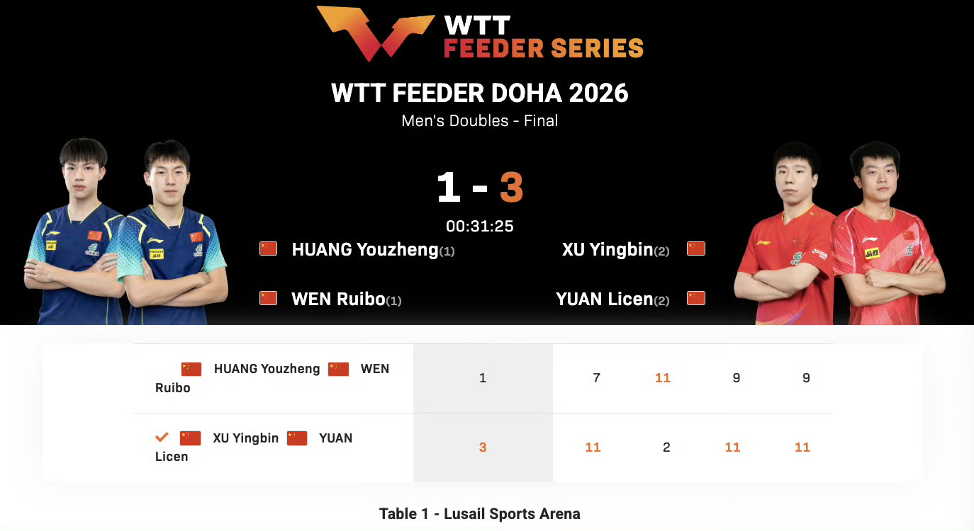 🏓2026WTT支线赛多哈站男双决赛,徐瑛彬/袁励岑3比1战胜黄友政/温瑞博夺得冠军,比分11-7,2-11,11-9,11-9