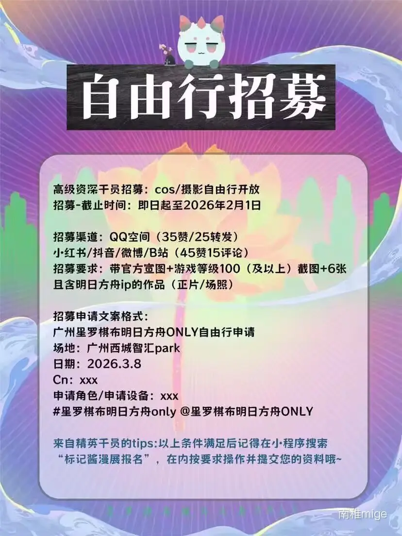 广州星罗棋布明日方舟ONLY自由行申请中~ 需要45赞15评论~谢谢宝贝们啾咪~ 场地:广州西城智汇park 日期:2026.3.8 Cn: 雨霁 申请角色:佩丽卡