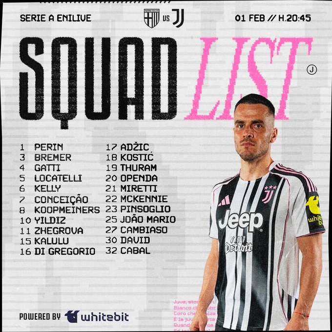 虎扑01月31日讯意甲第23轮,尤文图斯客场对阵帕尔马。尤文官方公布本场比赛球队大名单: