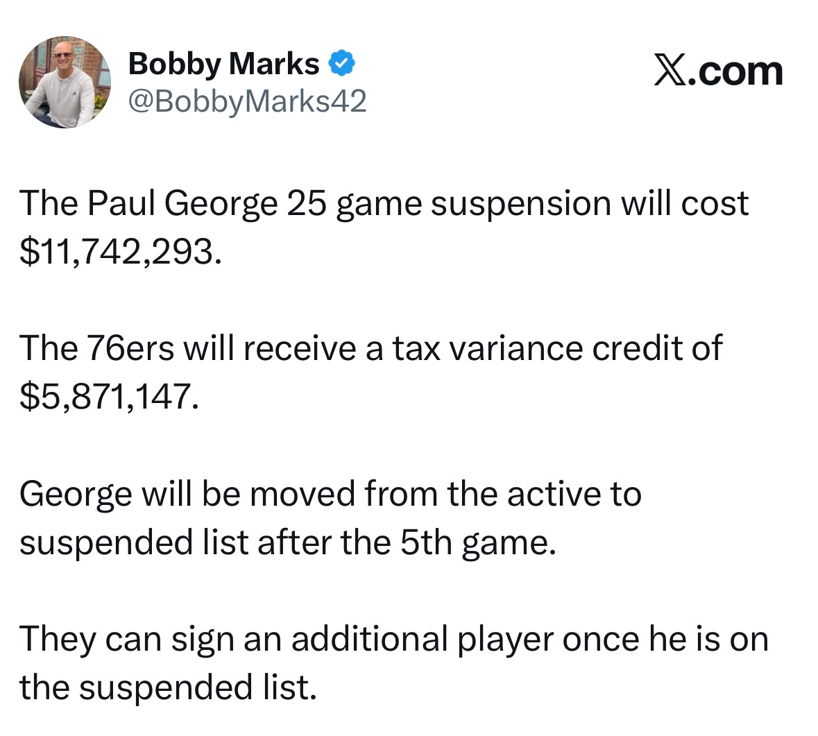 一旦乔治进入禁赛名单,球队便可签下一名额外球员补强阵容。