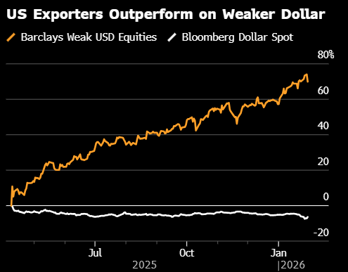 受益于弱美元的公司包括泛林集团、自由港迈克墨伦股份有限公司和新闻集团,这些企业的大部分收入来自海外。仅在1月,在彭博美元指数下跌1.3%的同时,该篮子股票已上涨8.1%。而受益于强美元的股票则表现不佳,其中包括达乐公司、纽柯公司和联合太平洋。