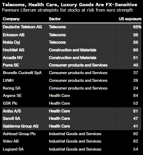 花旗集团策略师的分析显示,欧元兑美元若上涨10%,可能使欧洲企业每股收益下降约2%。他们发现,大宗商品、食品饮料、医疗保健、奢侈品和汽车行业的公司受影响最为明显。