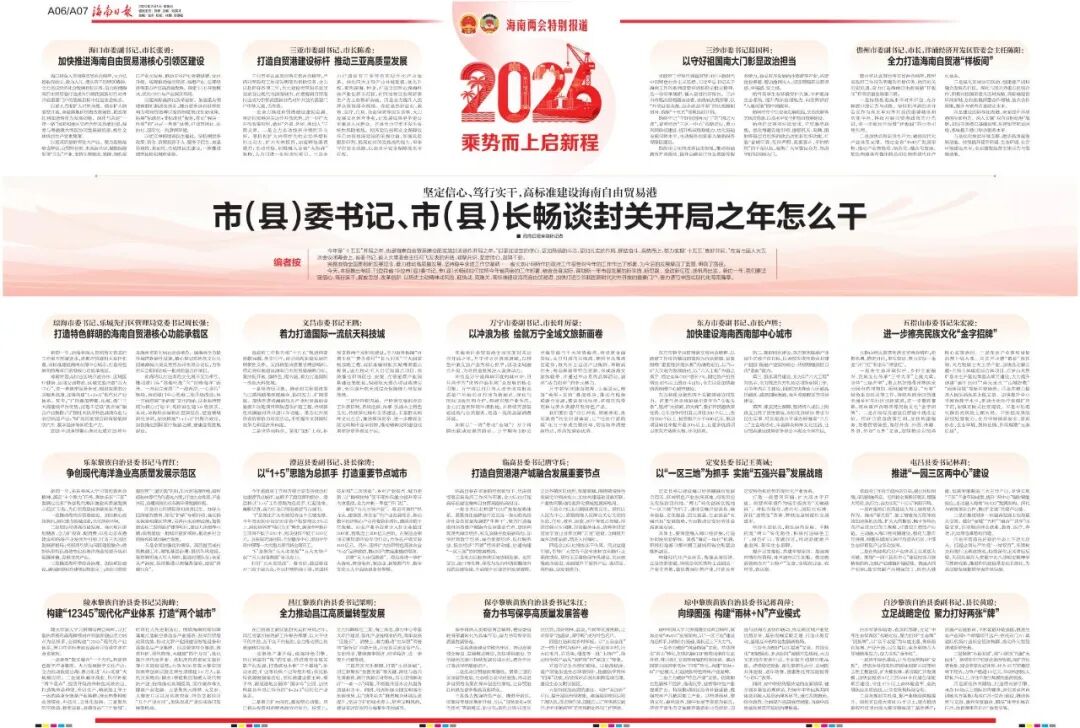 今天,海南日报推出专版,刊登我省19位市(县)委书记、市(县)长畅谈如何按照今年省两会的工作部署,结合自身实际,谋划新一年市县发展的新举措、新思路。奋进新征程,扬帆再出发。新的一年,我们要坚定信心、笃行实干,解放思想、改革创新,以历史主动精神战风险、迎挑战、克难关,高标准建设海南自由贸易港,加快打造引领我国新时代对外开放的重要门户,奋力谱写中国式现代化海南篇章。