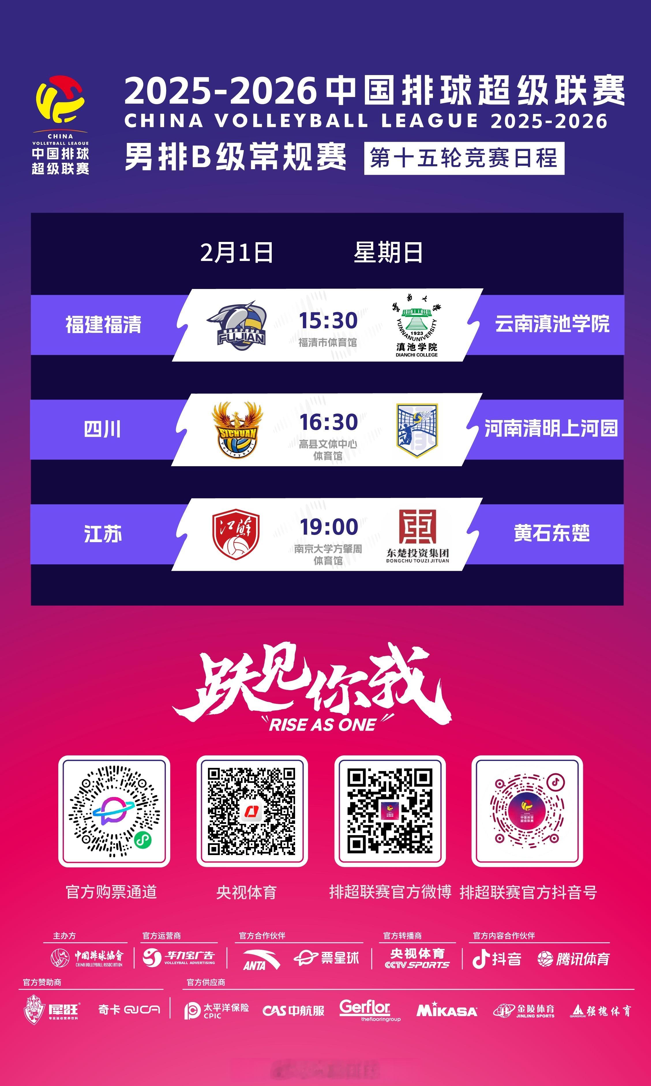 2025-2026中国男排超级联赛 A级常规赛第14轮、B级常规赛第15轮今天上演,具体的竞赛日程是: