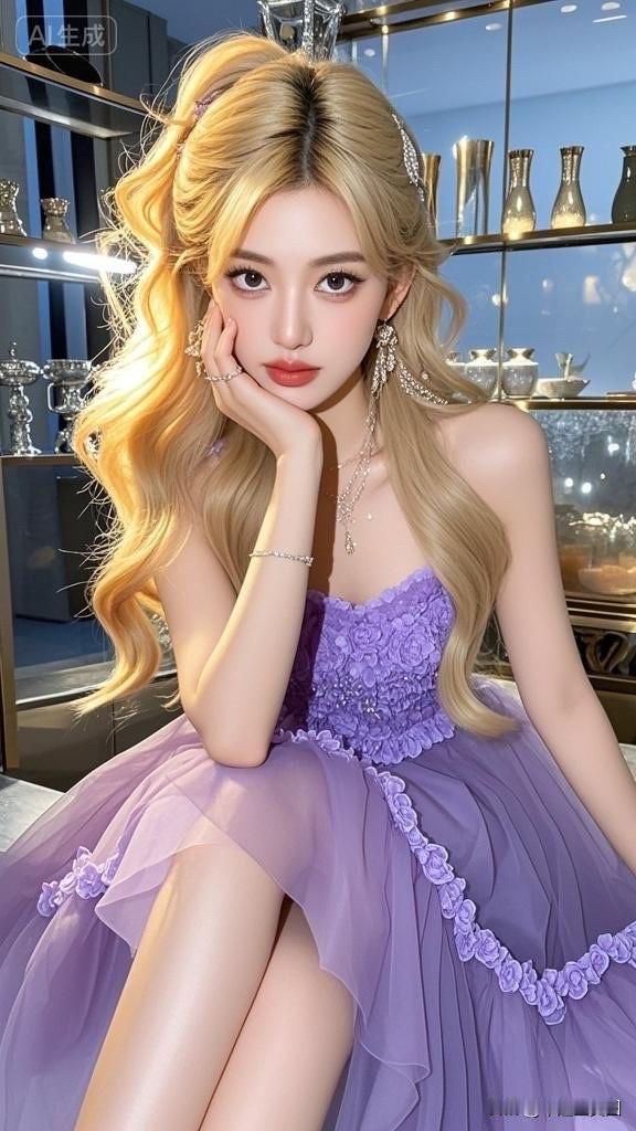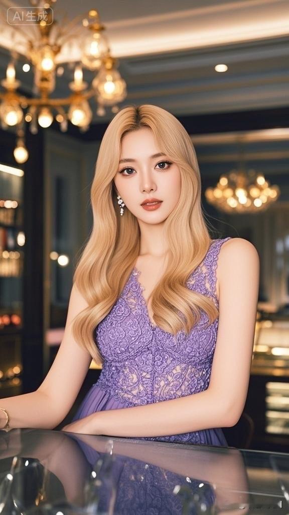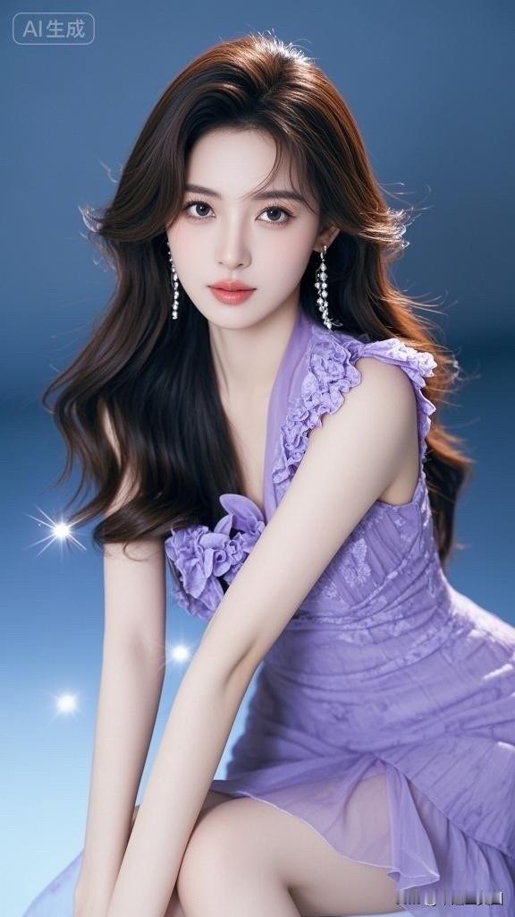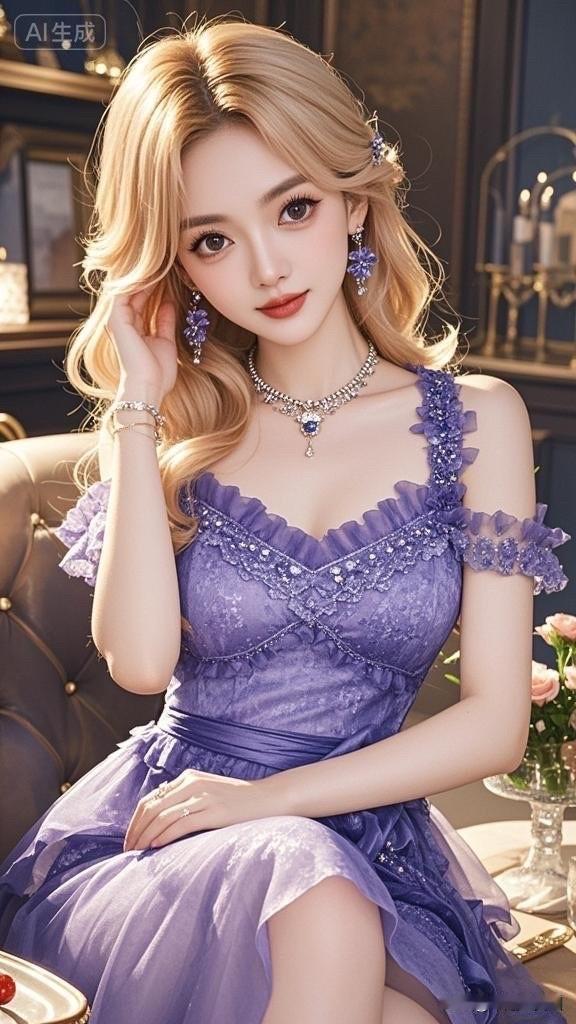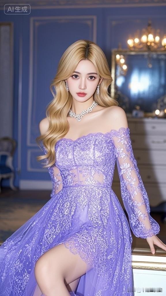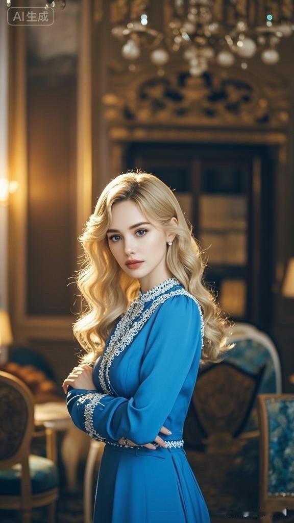 这位女士穿着蓝色礼服,看起来优雅迷人。