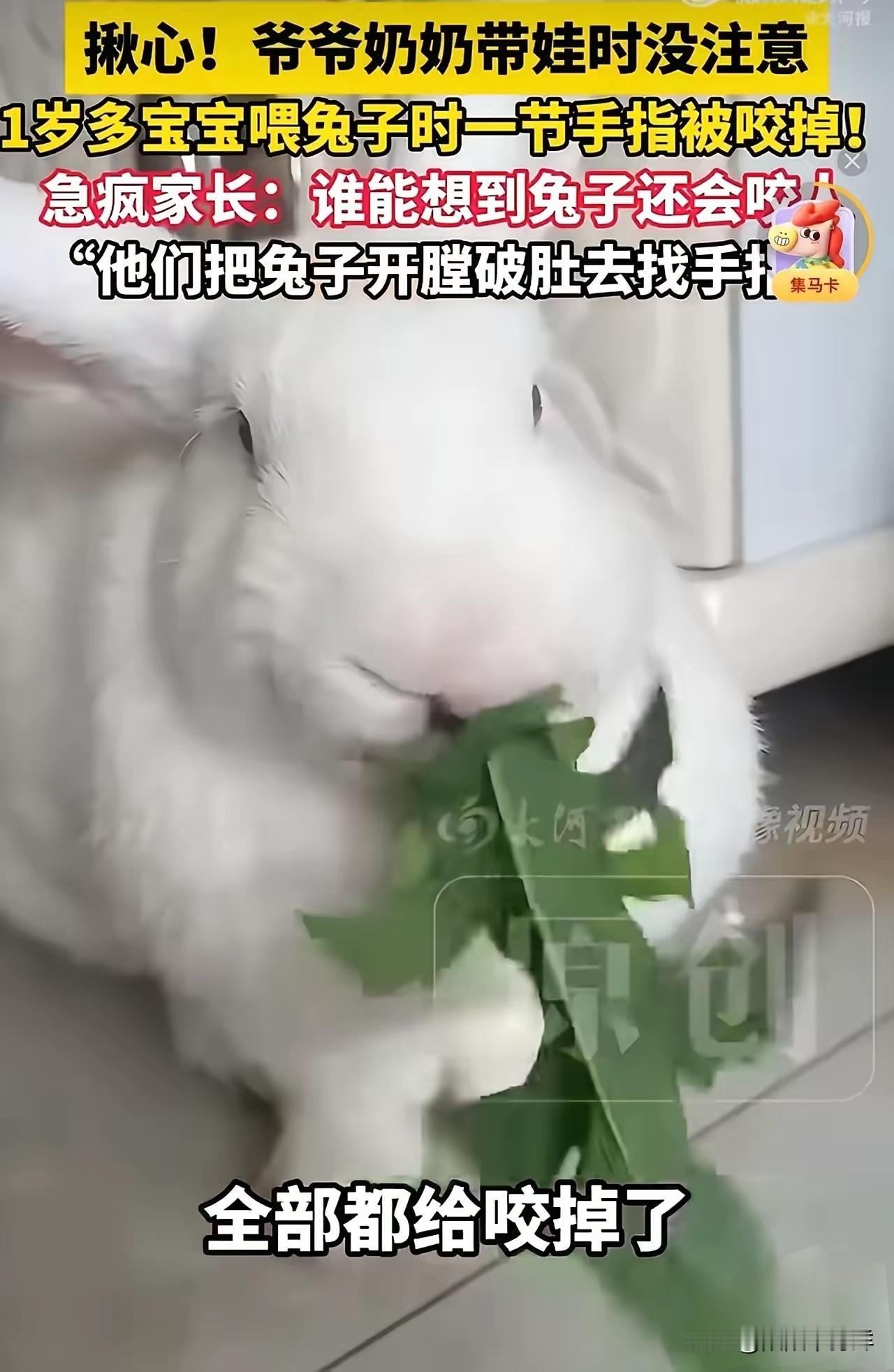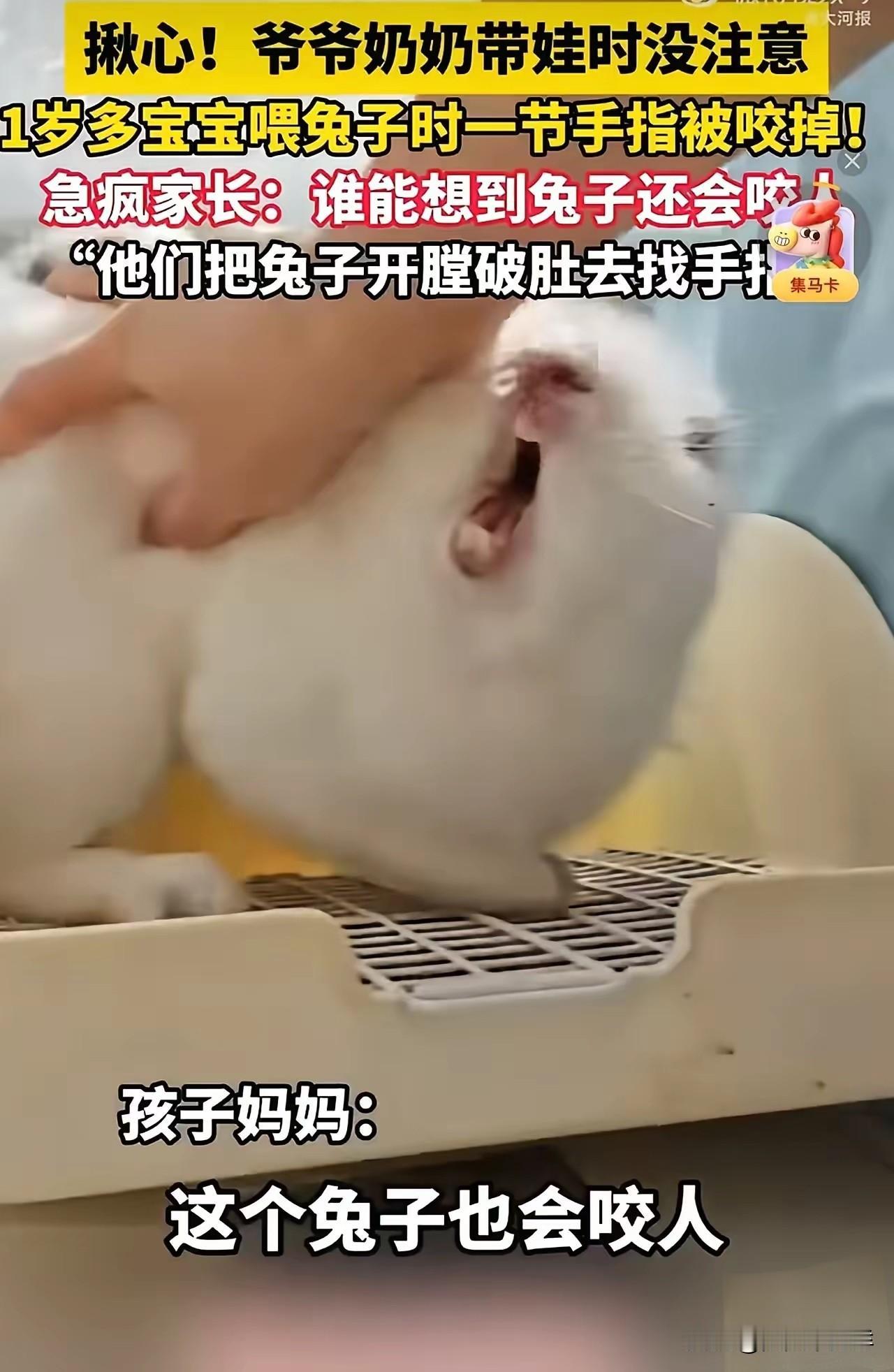 悲剧还是发生了!1岁男童喂兔子时手指被咬断,家长为找断指将兔子开膛破肚,妈妈:误以为被兔子吞进肚子,孩子断掉的手指已顺利成活。 事发当天是周末,爷爷奶奶带着1岁多的孙子在院子里喂家里养的宠物兔。小家伙攥着菜叶凑到兔笼边,刚把手指伸进去,兔子突然猛地一咬,一节手指直接被咬断,疼得孩子当场大哭。 老人吓得手足无措,第一反应是断指被兔子吞进了肚子。他们来不及多想,直接把兔子抓出来开膛破肚,翻遍了兔子的胃和肠道,也没找到断指。直到孩子妈妈赶回家,才在兔笼角落的草屑里发现了那截沾血的手指,赶紧带着孩子和断指往医院跑。 万幸的是,送医及时,医生连夜做了断指再植手术,孩子的手指最终顺利成活,后续还需要长期康复训练。兔子的结局却早已注定,开膛破肚后没了气息,只留下一个被紧急切开的伤口。 这事传到网上,评论区瞬间炸了。有人心疼孩子,觉得家长太粗心,让这么小的孩子单独接触兔子。也有人惋惜兔子,说它只是本能反应,不该为人类的失误付出生命代价。 想起去年看到的新闻,江苏一个2岁小孩喂仓鼠时被咬伤手指,家长直接把仓鼠摔死。两起事件里,宠物都成了家长疏忽的牺牲品。 很多人对兔子有误解,觉得它温顺无害。实际上,兔子急了会咬人,尤其是发情期或护食时,咬合力足以咬断人类的手指。1岁多的孩子动作没轻重,家长没在旁边盯着,风险本就极高。 更让人唏嘘的是,家长第一时间不是找断指、送孩子就医,而是把兔子开膛破肚。这种慌乱下的错误判断,不仅耽误了救治时间,也让一条无辜的生命白白死去。 养宠物的家庭,最该做的是提前做好防护。给宠物笼加装防护网,不让孩子单独喂食,这些细节都能避免悲剧。兔子咬人是本能,但家长的疏忽才是事件的根源。 孩子的手指保住了,是不幸中的万幸。可这起事件也给所有养宠物的家庭提了醒:别低估小动物的攻击性,别高估自己的反应速度。保护孩子的同时,也别让宠物为人类的失误买单。 各位读者你们怎么看?欢迎在评论区讨论。