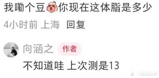 向涵之体脂率13%向涵之的体脂率 向涵之回复粉丝说自己体脂率是13%,果然女艺人都是自律的啊