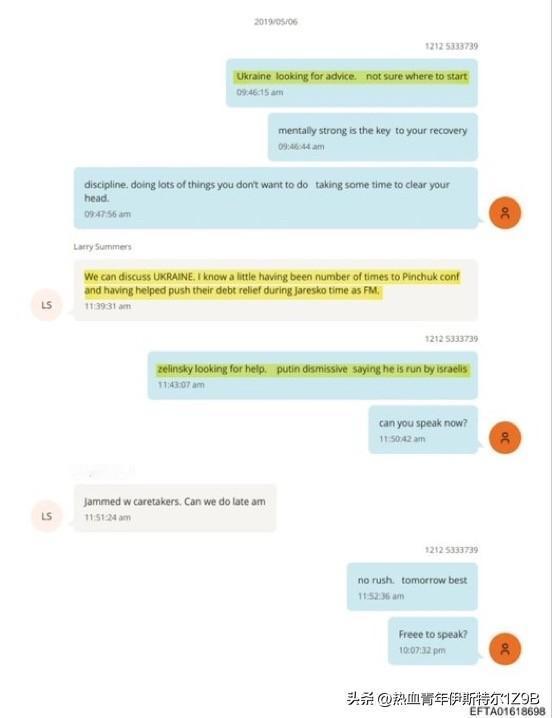 爱泼斯坦声称普京表示泽连斯基受以色列人控制。 2019年5月6日,泽连斯基赢得大选两周后,爱泼斯坦和拉里·萨默斯就泽连斯基互发短信。当时泽连斯基刚刚胜选,但尚未就职。 爱泼斯坦:“乌克兰正在寻求建议,但不知道从何入手。” 爱泼斯坦:“泽林斯基寻求帮助。普京不屑一顾,称他受以色列人控制。”