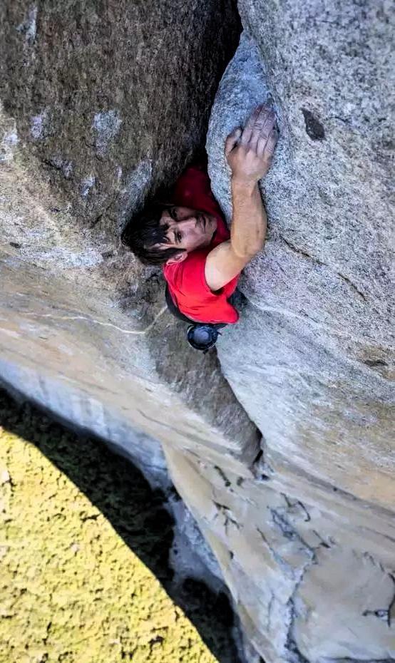 几年前就看过《徒手攀岩》这个获奥斯卡大奖的纪录片,当时印象就挺深刻。今天因为这老兄又徒手攀登宝岛的101大厦,看了网上各种视频剪辑,意犹未尽,就有找出这个片子再看了一遍,还是意犹未尽。 这位天才的徒手攀岩之神,刚刚才 5岁的艾利克斯在加州萨克拉门托的一家室内攀岩馆第一次接触岩壁时,便对这个垂直的世界产生无限的向往和憧憬。打十岁开始,他每周都雷打不动地进行专业的训练,此后参加各种各样的比赛成了他的日常生活中的家常便饭。他非常善于思考和总结,在他的笔记上密密麻麻记满了是先迈左脚还是右脚、吸几口气、怎样转身和换手以及线路上各种特质标识等等的细节问题。 2012 的艾利克斯就被101独特的竹节结构与祥云和龙形装饰所吸引,彼时尚他还没有征服酋长岩。这座当时世界排名第三的摩天大厦,在他眼中简直就是都市里的酋长岩。然而当绳索试攀完成、一切筹备就绪时,官方因却因在安全上的顾虑取消了活动,让一年多的精心准备沦为失望和遗憾。 酋长岩为巨型花岗岩独石,高914米,垂直陡峭,手点和脚点极难辨识。Freerider全长884米,关键难点包括极限平板、怪兽大裂缝、耐力角、第27段横切等,容错率为零。 艾里克斯自2009年起筹备,以绳索反复演练路线,熟记每一个动作细节,配合心理训练与体能强化。 2016年他第一次徒手攀登酋长岩失败了,当时刚刚爬过平台,天还未大亮,他嘴里好像是说着自己作弊了,情绪很沮丧。电视台导演不断地安慰他,让他休息一段时间,可他一会到他的车里,在女友不解的目光中,又开始在车门上进行悬挂锻炼。 他很直白,是个单纯的人。女友问他会不会因为对她有义务而放弃徒手攀岩,他没有丝毫犹豫就说自己没有这个义务。女友的眼神很失望,但相信他的真诚。 2017年6月3日,凌晨出发的艾里克斯无保护徒手无保护登顶优山美地国家公园914米的酋长岩,耗时3小时56分钟,其线路FREERIDER难度系数5.13A,他成了史上首次完成这个英雄壮举的人,他登顶的瞬间被称为攀岩界的登月时刻。