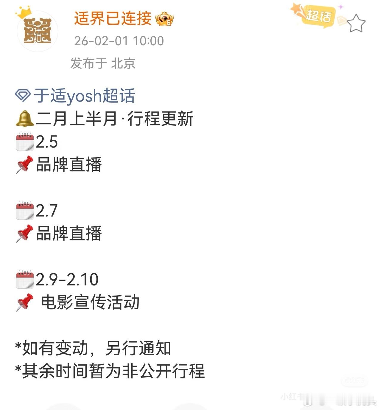 于适二月上半月行程,多个品牌直播,还有电影宣传活动,大明星很忙碌
