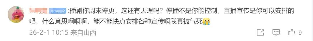 “太平年停更”上热搜当晚,@电视剧太平年曾发博回应:小老年顺着网线就来啦~~鱼脍热酒备好了,2月1日晚准时在CCTV-1@CCTV电视剧、@爱奇艺@芒果TV@腾讯视频等着大家,说好了都不许缺席嗷。