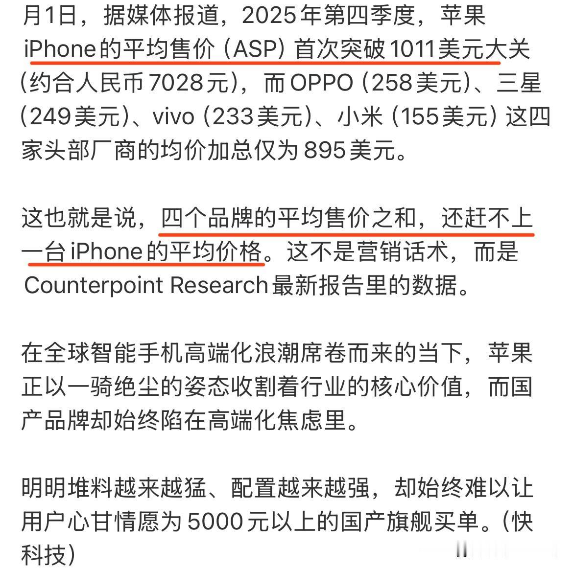 得益于iPhone 17系列的热销。 iPhone的平均售价(ASP)首次突破7000元大关(图二),1011美元。 作为对比,包含三星、小米和OV在内的另外四家均价加起来还不及苹果一家。 再看销量(图三),2025年苹果的出货量和市场份额也是全球第一。 高于竞争对手的售价,再加上又是全球销冠,怪不得说苹果拿走了手机行业绝大数的利润,不服不行,实力使然,卖的贵又卖的最好。 苹果手机的统治力比想象中还要强大…… 就像这次iPhone的促销,从iPhone15、iPhone air到iPhone17、17pro,苹果覆盖的价格带越来越宽泛,对其他品牌的影响也会越来越明显。