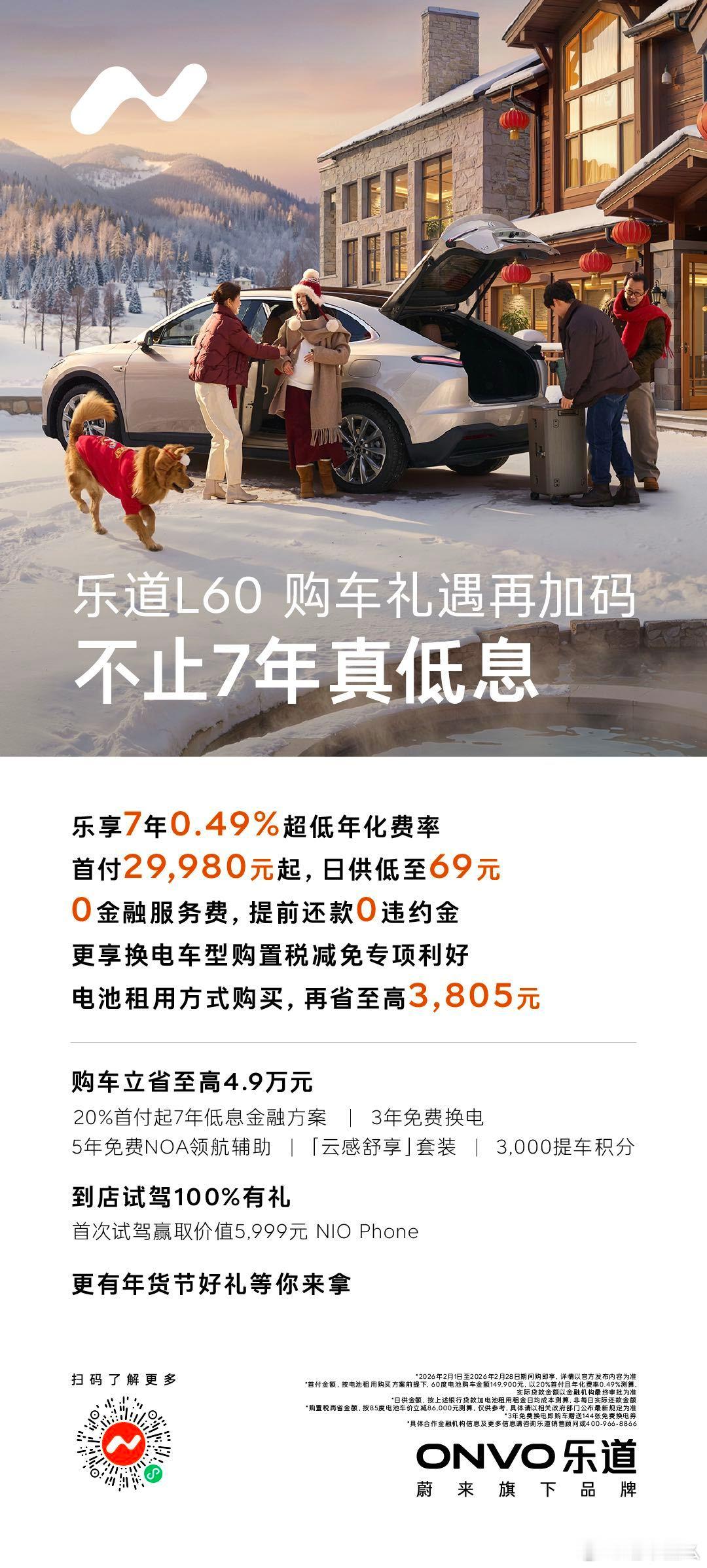 乐道汽车 2月购车政策重磅加码,推出7年超低息金融方案:
