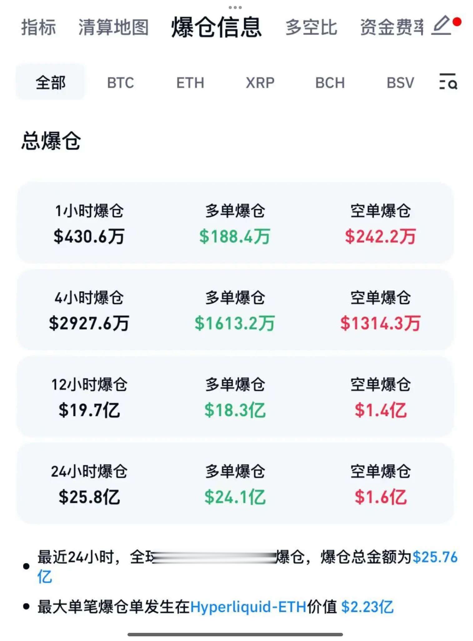 Coinglass数据显示,过去的24小时内,加密货币全网合约爆仓25.8亿美元,爆仓人数超43万人。其中,多单爆仓24.1亿美元,空单爆仓1.6亿美元。最大单笔爆仓单发生在Hyperliquid-ETH,价值2.23亿美元。
