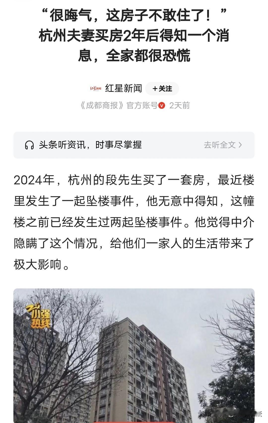 “无理取闹?”浙江杭州,男子买房住了2年,1月14号楼上有人坠楼,他意外听说之前有过2起坠楼事件,他找中介退房、索赔,理由是中介刻意隐瞒关键信息,家里人吓得不敢住在房子里了,觉得晦气,心里有忌讳。中介却说:这房子从法律上不算凶 宅,你不能让我去了解整栋楼有没有出过事。不过,中介还是给男子一个解决方案,这下男子又纠结了。 2024 年,段先生经过一番精挑细选,在余杭区某小区购置了一套房子,房子位于 27 层楼的 5 楼。 本以为就此能安安稳稳地扎根下来,可谁能想到,平静的生活很快就被打破。 2026年1 月 14 日那天清晨,段先生一家还在睡梦中,突然被楼下一阵嘈杂声惊醒。那动静,就跟炸开了锅似的,楼下好多人扯着嗓子大喊“抢救抢救”。 段先生心里“咯噔”一下,赶忙出门查看,这才听说,楼上有人坠楼了。 这还没完,段先生从邻居们七嘴八舌的议论中,得知了一个晴天霹雳的消息:在他买房之前的几年里,这幢楼竟然已经发生过两起坠楼事件了! 这消息就像一颗重磅炸弹,把段先生一家炸得晕头转向。 段先生的妻子得知此事后,整个人都崩溃了,吃不好睡不好的,吓得连家里都不敢住了,孩子也跟着害怕。 一家人整日惶惶不可终日,生活仿佛笼罩在一片乌云之下。 段先生更是气得火冒三丈,他觉得当初买房的时候,中介这是在故意隐瞒关键信息,把他们一家坑惨了。 段先生对此非常不满,“买房前你们居然刻意隐瞒这么重要的事情,这不是把我们往火坑里推吗?” 他气呼呼地说道,“现在好了,我们觉得这房子晦气得很,风水差到家了,我们可不敢再住下去了!” 段先生的妻子也满脸委屈地对记者诉苦:“他们作为专业的中介,就应该把房源的所有信息都应该了解得清清楚楚,像这种坠楼事件,怎么能不告诉我们购房者呢?这不是坑人吗!” 其实啊,从段先生一家的角度来看,他们的反应可以理解。对于咱们普通人来说,买一套房不容易,普通家庭也不会经常换房子,一住可能就是一辈子。 但是,是他们这栋楼上有人坠楼,并不是段先生家住的房子里出事,他们对此心里有忌讳。 段先生当初是通过中介买的这套房子,如今出了这事,他觉得这房子住的瘆得慌,强烈要求退房,还让中介赔偿他因买房投入的所有损失。 中介门店的李店长一脸无奈地解释道:“当时是一位姓谢的中介把房子卖给段先生的,可他对房子之前发生过的时也不知情。 我们觉得,如果意外事件是发生在段先生住的房间里,那肯定存在刻意隐瞒,我们肯定会承担责任。 但现在情况不一样啊,这又不是发生在本套房内,业务操作里可没有规定一定要了解一幢楼的所有事情。” 李店长还表示,段先生要求他们回购房子,这事儿他已经汇报给总部了。 随后,记者又马不停蹄地赶到了该公司的总部。 总部李经理也是一脸无辜地说:这套房子本质上不算是凶 宅。你从法律角度来说,也不算。另外,我们跟小区里的其他业主也聊过,对这事好多人都不知道。 公司还表示,让我们去核实小区之前发生的所有意外事件,在现实操作中简直比登天还难。毕竟小区那么大,事情那么多,怎么可能事事都了解得那么清楚呢? 不过,段先生坚持要退房,并让对方赔偿相应损失。 该公司也给出了一个初步解决方案,如果段先生的这套房想卖掉的话,或者他想重新买二手房,产生的中介费可以给予减免。 段先生听了这个方案后,眉头紧锁,思索片刻后说:这事儿我得好好考虑考虑,之后再跟他们协商。 有网友说,这家恐怕当时买在高点上,现在房价下跌,这才是最主要的因素。称家人不敢住,饭也吃不下去,那就是自己心里在闹鬼。按照该住户的想法。是不是整栋楼的住户都应该搬走?这个楼得是不是得拆了重建?自己闹心,把房卖了,搬走就是了。 还有网友说,这个买家就有点生搬硬套了,又不是在自己住宅内,而是在整幢楼的其中之一套内曾经发生过,按这样的逻辑,如果生病要在医院住院,是否要问清楚该病床上是否有人离世,难道就不住院治疗了? 那么,段先生要求中介公司退房并赔偿买房投入的损失,合理吗? 《民法典》第962条规定:中介人应当就有关订立合同的事项向委托人如实报告。中介人故意隐瞒与订立合同有关的重要事实或者提供虚假情况,损害委托人利益的,不得请求支付报酬并应当承担赔偿责任。 此事中,坠楼事件发生在楼栋公共区域,并没有发生在段先生购买的房屋内部,不属于必须披露的房屋瑕疵。 且中介能举证自己对历史坠楼事件不知情,不构成“故意隐瞒”。 另一方面,民间的“风水忌讳”不能作为退房依据。 法律认可的退房理由是房屋存在质量缺陷或交易欺诈,心理层面的不适难以成为解约的合理事由,段先生以“晦气”为由要求赔偿缺乏法律支撑。 有人说,楼上发生的事情和他住的房子不搭界,因为不是在房屋里发生的事情,不能算房屋问题,你怎么看呢? 来源:小强热线 红星新闻