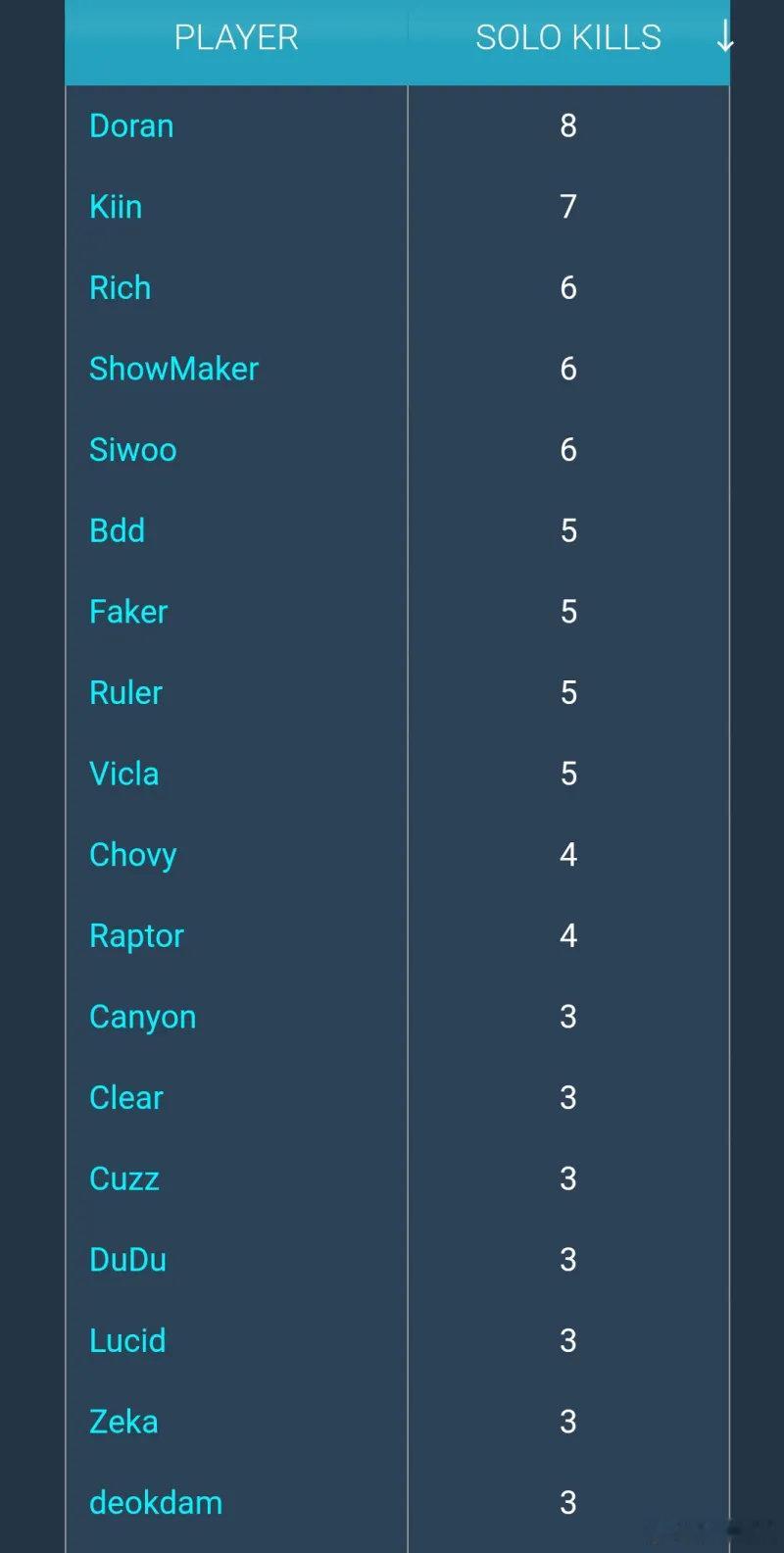 Lck杯目前的单杀榜。今天打完kiin有机会超吧?