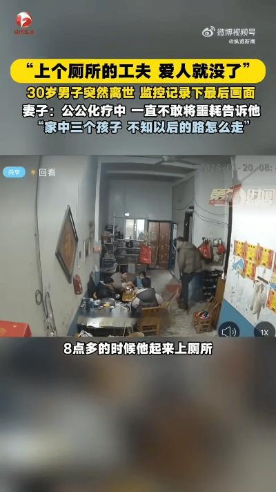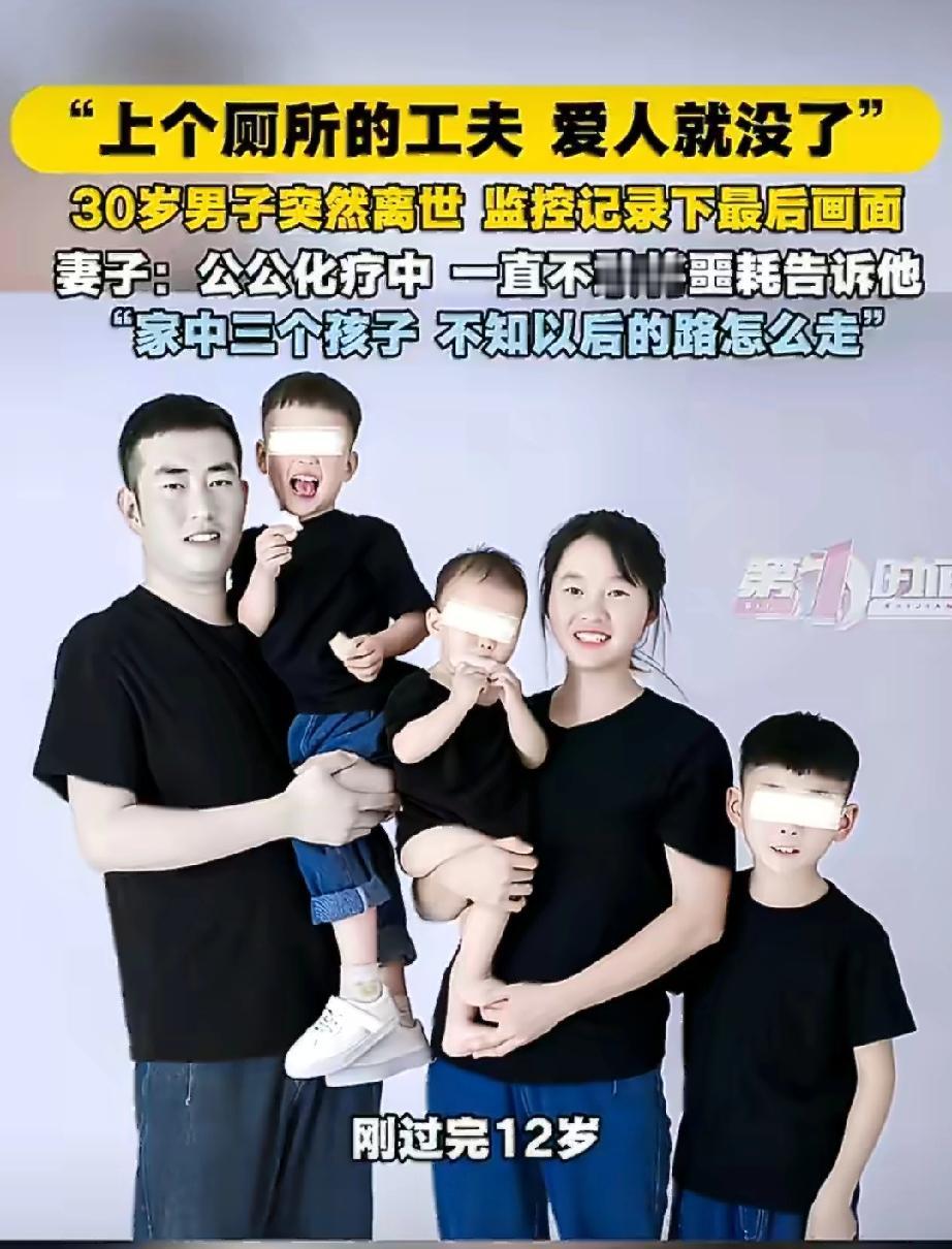 河南安阳,30岁男子早上起来上厕所,在卫生间突然晕倒,家人急忙做心肺复苏,还是没能挽回男子生命,医生诊断为心源性猝死。 监控记录下男子最后的画面,可以看出去厕所平安他还一切正常。 如今丈夫突然离世,妻子哭诉留下三个年幼的孩子和化疗中的公公,以后得日子了怎么办? 她们的遭遇引起网友激烈讨论,有网友说:家徒四壁还要生三个孩子。 还有网友说:穷汉儿多,咋生这么多啊,生一个意思一下就行了啊,三个压力大,还有患病的爸,不死也想自杀的程度。 甚至有网友给他算起人生轨迹:男子30岁,儿子12岁,那18岁就当爸了,17岁让女方怀孕。如果女方年龄比他小个两三岁,那女方就是15岁左右怀孕,早恋早生不可取! 网友的关注点可真是奇怪,不应该觉得这家人十分可怜,想办法帮助他们吗? 再不然吸取教训,以后胸痛一定提前就医,好好检查,避免意外的发生。 不过话说回来,这位男子的遭遇和他的生活密切相关,如果不是生这么多孩子,还要照顾生病的父亲,这个男子说不定能生活的更好,休息好,也就不会发生意外了。 你们觉得呢?