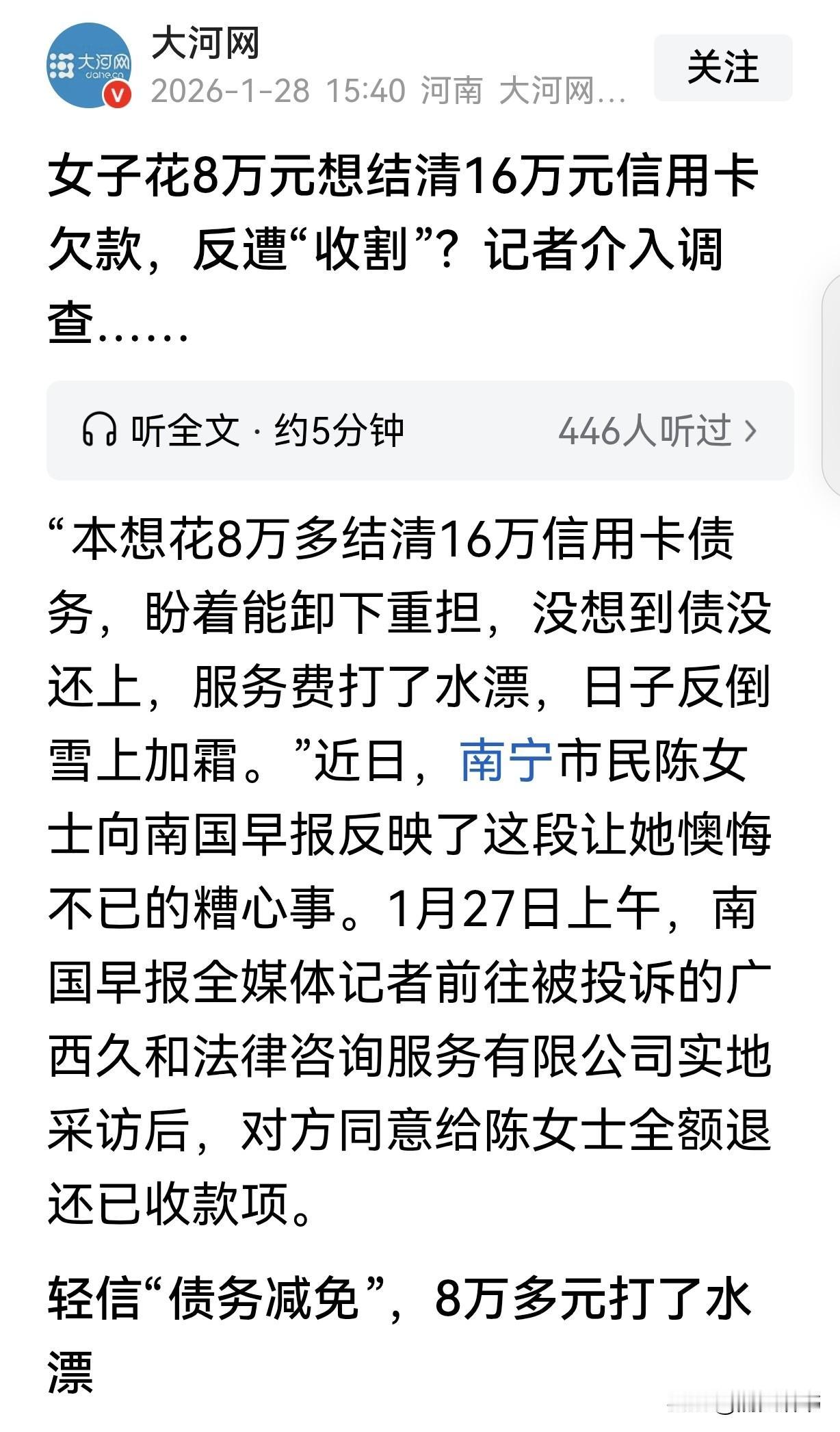 “赶紧下载反诈app!”广西南宁,一女子信用卡套现16万,没钱还了,她看到朋友圈有人宣传:我们是承接信用卡网贷逾期业务的,如果你欠10万元,只要给我5万元,就能帮你把债务解决。女子欣喜若狂,立马联系上对方,对方说女子给他8万,他就能把女子的16万欠款平了。女子信以为真,结果傻眼了。 事情还要从陈女士套现说起,手头急缺钱又借不到的她,干脆从3张信用卡里套了16万,本以为能撑过去,结果彻底陷入了还款困境。 拆东墙补西墙的日子没过多久,就再也没墙可拆了,窟窿越滚越大。每天催款电话、短信不断,陈女士连手机都不敢随便接,急得像热锅上的蚂蚁。 就在她走投无路的时候,翻朋友圈偶然看到一条宣传,瞬间动了心。对方说专门帮负债人解决难题,欠10万只要给5万,就能一笔勾销。 那会儿的陈女士,就像溺水的人抓到了救命稻草,根本没多想,立马联系上了宣传里的人,也就是这家所谓“债务处理公司”的黄某。 黄某告诉陈女士,她这16万欠款,只要交8万服务费,公司就能帮她彻底平掉,再也不用被催款骚扰。 陈女士一听,当场就松了口气,别说8万,只要能解脱,再多一点她都愿意。可黄某又提了要求,得等3张信用卡都逾期7天,才能接单,而且每张卡要单独签约、分开计费。 被债务逼疯的陈女士,哪还有心思琢磨不对劲,黄某说什么她都答应,全程百依百顺,就盼着能早日无债一身轻。 随后,陈女士一一照做,前前后后交了83522元服务费,还签了合同。合同里写着,服务周期3到18个月,直到银行或小贷公司出具结清证明、她的征信显示结清为止。 交了钱、签了合同,陈女士本以为能高枕无忧,可现实给了她沉重一击——催款电话、短信压根没停,就连银行卡都被冻结了。 她的生活彻底乱了套,本来就负债累累,现在更是雪上加霜。陈女士赶紧找到黄某问责,可对方只敷衍她说这是正常流程,让她再等等。 看着黄某不耐烦的态度,陈女士追问得紧了些,黄某竟然直接把责任推到了她身上。直到这时,陈女士才如梦初醒,自己根本不是跳出了火坑,而是又掉进了另一个更大的坑。 气不过的陈女士,当场提出解除合同、退还8万多服务费,可对方却泼了她一盆冷水:解除可以,但陈女士属于违约,要支付30%的违约金。 这句话彻底压垮了陈女士,本来就一屁股债,现在服务费要不回,还要再付违约金,她感觉天都要塌了,走投无路之下,只好找媒体求助。 还好记者介入后,这家公司怕事情闹大影响声誉,想息事宁人,最终把83522元服务费全额退还给了陈女士,陈女士这才稍稍松了口气。 其实这件事,真的给所有负债人提了个醒,也给我们普通人敲了警钟。现在的骗子,真的无孔不入,专挑人最脆弱、最着急的时候下手。 负债的滋味不好受,被催款的日子更是煎熬,可越是这个时候,越要冷静,越不能病急乱投医。世上根本没有“花一半钱平全部债”的好事,更没有能随便洗白征信的捷径。 太多类似的骗局都是骗子抓住了负债人“想快速解脱”的心理,画一个虚假的大饼,一步步诱导你交钱、签合同,等你发现不对劲的时候,他们要么敷衍推诿,要么狮子大开口要违约金。 还有一点特别重要,不管什么时候,签合同之前,一定要逐字逐句看清楚,千万别听对方口头承诺,更不能随便签字。涉及金钱往来,一定要保留好聊天记录、转账凭证,必要时给电话录音。 如果真的欠了钱还不上,正确的做法是什么?不是找这些所谓的“债务处理公司”,而是直接找银行或者正规的金融机构协商,申请分期还款或者延期还款,一步一步慢慢还,虽然难,但至少踏实。 那些声称能“平债”“洗白征信”的,十有八九都是骗子,他们根本没有任何能力解决债务,只是想趁机骗取你的服务费,把本就艰难的你,往绝路上再推一把。