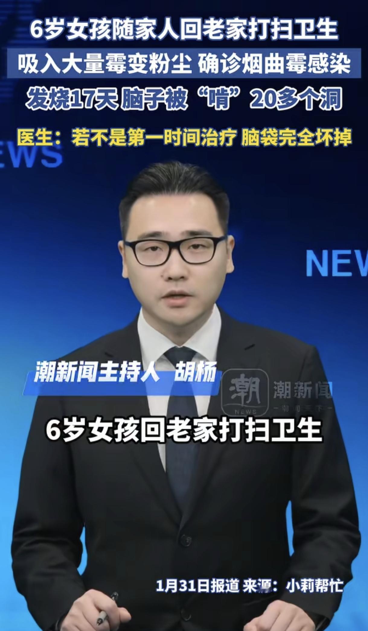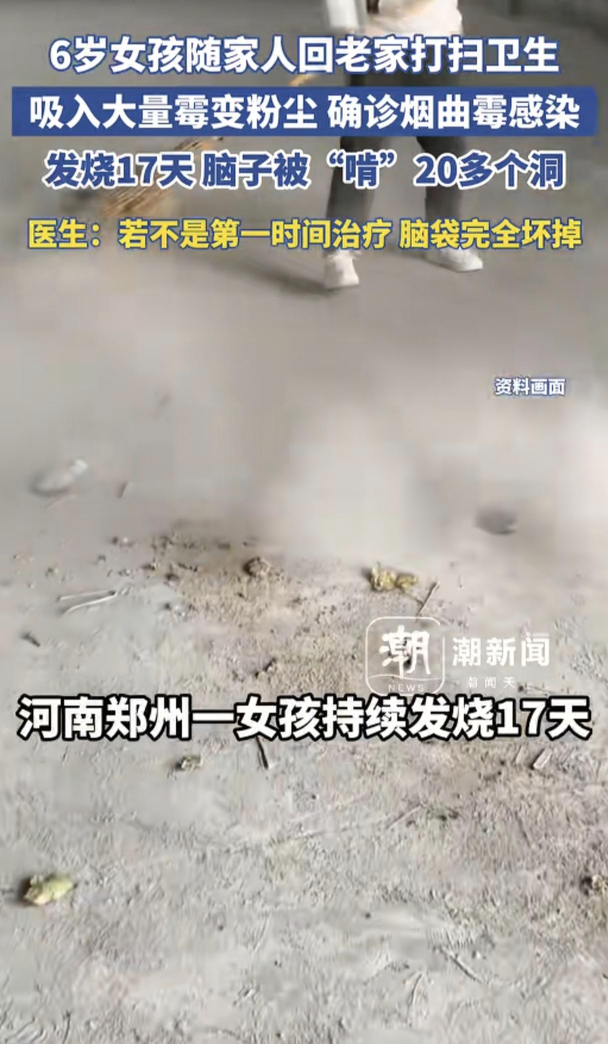 “看得脑壳发麻!” 6岁女孩跟着父母回老家打扫卫生,由于老家空置已久,打扫起来粉尘漫天,小女孩吸入了大量霉变粉尘,开始出现咳嗽、胸闷、发烧等症状,父母以为孩子得了感冒就没太在意,没想到女孩竟一连反复发烧了17天都没有好转,父母这才赶紧将她送医院救治,经诊断,女孩被确诊为“烟曲霉感染”,还因发烧了17天脑子被“啃”了20多个洞,而幸好家人最终及时送医院,不然女孩的脑子真会完全坏掉,这事没想到这么严重,真是看得人头皮发麻啊。 (来源:湖新闻) 临近年关,相信家家户户都在打扫卫生、除尘等,在城里工作的人还会带家人回老家过年并打扫老房子等,以崭新面貌迎接新年。但正因新年除尘就发生了这样一件发人深省的事。 近日,河南郑州,一位6岁女孩跟随父母回老家过年,由于老家子很久没人居住灰尘太多,需要打扫干净才能居住,于是一家人就忙活开了。 小女孩见大人们都在忙碌着,小小年纪的她也不甘示弱,就懂事地帮助大人扫地、擦桌子、收垃圾,归整家具,等等,干得不亦乐乎。 谁知,当晚女孩就出现咳嗽、胸闷、头痛、流鼻涕等症状,父母以为女儿不适应老家的气候感冒了,就买了感冒药给女儿喂下。 小女孩吃了感冒药后有所好转,但一两天后又开始咳嗽,并反复发烧、打喷嚏等,浑身乏力,有时还出现呼吸困难、意识模糊等症状,就这么时好时坏了17天之久。 这天,小女孩病情又加重了,烧得意识模糊,一直在说胡话,父母吓坏了,赶紧将女儿送到郑大一附院急诊。而正是这一决定,最终挽救了女儿。 经医生诊断,小女孩被确诊为“烟曲霉感染”。 医生还发现,女孩脑子已经被“啃”出20多个洞了。原来可怜的小女孩在发烧的17天里一直在与真菌搏斗,最终脑子被真菌啃噬出20多个洞,看得人太揪心了! 而幸好女孩送医治疗不算太晚,不然脑子就完全坏掉了。不得不说,父母还是太粗心了,女儿发烧了17天才送医救治,这心不是一般的大。 女孩的主治医师称,女孩是吸入了大量的霉变粉法,之后真菌进入血液又跑到了脑子里所致,所幸孩子在脑子完全坏掉之前及时送医救治,不然后果真是不堪设想。 衷心期待这位小女孩能够早日痊愈~ 网友们看到这一幕,纷纷热议。有网友说,感觉现在真菌越来越厉害了,以前像毛囊炎、脚气等这些小病都能治愈,现在一旦染上基本就跟一辈子了。 也有网友说,现在的小孩子太干净太娇气了,小时候的我们体质多好啊,父母在地里干活没空带就把我们扔到地上乱爬, 我们身体还一点事没有。 还有网友说,为啥大人没事?关键还是小孩子抵抗力太差,体质太弱,免疫力低下,容易被真菌入侵。不管是大人还是小孩,打扫卫生一定要戴好口罩,就算没有霉也有灰尘。 其实,烟曲霉对于每个人而言都是十分危险的,它属于曲霉科的一种条件致病真菌,若感染上,轻则哮喘、咳嗽等,重则咯血、侵入人体各个系统,比如侵入脑子让脑子坏掉,等等。 这名小女孩的遭遇也给大家提了个醒:临近年关,我们在打扫家里卫生准备过年时,一定要全程做好防护,如戴好口罩,注意消毒,等等。若打扫久不住人的房屋,一定不要让孩子逗留,墙角若有发霉发黑应立刻处理,以免造成严重后果。 总之,年关除尘打扫卫生,我们一定要注意防护,千万不要掉以轻心,以健健康康、开开心心的过大年。