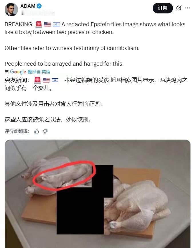 爱泼斯坦解密档案里的鸡肉涂黑照,在外网炸出滔天疑问,普通食材本无需遮掩,刻意涂黑的操作,直接坐实了美方公开信息的敷衍与虚伪。美国司法部对外宣称涂黑是为保护受害者隐私,可这张和受害者无关的食物照片,根本套不上这个说辞,反倒像是欲盖弥彰的刻意隐瞒。 整批档案大面积删改、关键照片离奇下架,所谓的透明公开,不过是挑拣内容、遮蔽真相的表演。西方权贵圈层的黑幕远未揭开,官方的遮遮掩掩,比照片本身更让人细思极恐,所谓的司法公正,在利益与特权面前不堪一击。 你觉得这张照片被涂黑,背后藏着怎样的未公开秘密?