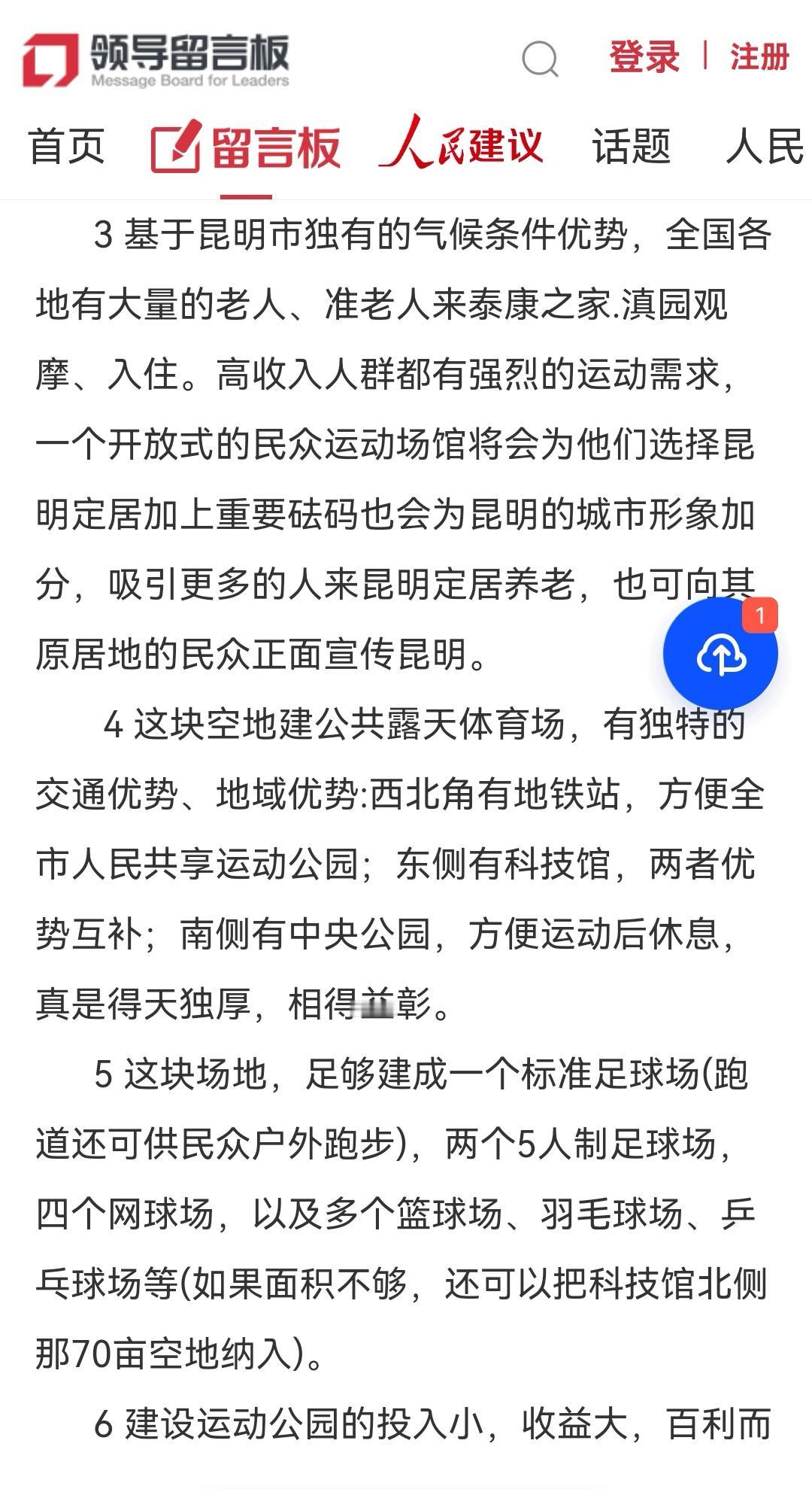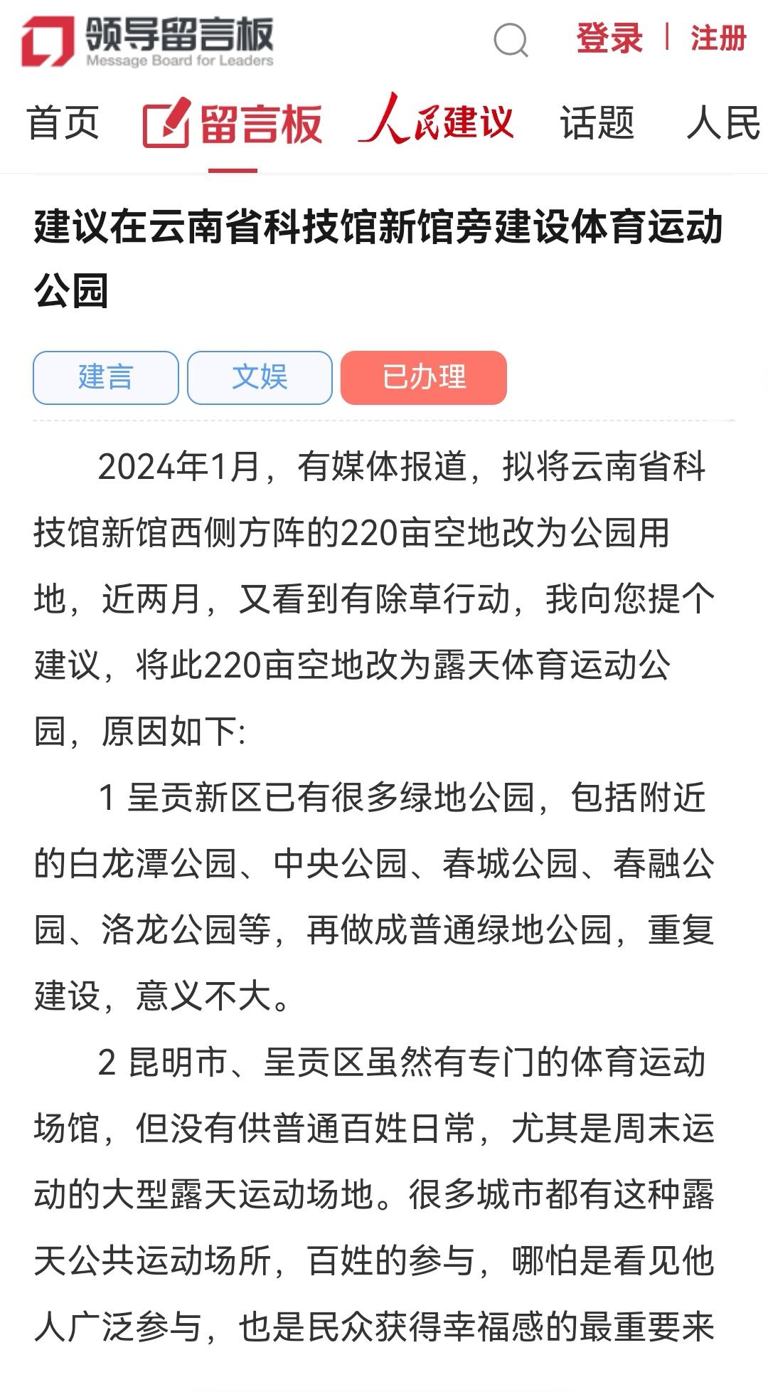 近日昆明网民在领导留言板向市委书记留言: 建议在云南省科技馆新馆旁建设体育运动公园 2024年1月,有媒体报道,拟将云南省科技馆新馆西侧方阵的220亩空地改为公园用地,近两月,又看到有除草行动,我向您提个建议,将此220亩空地改为露天体育运动公园,原因如下: 1 .呈贡新区已有很多绿地公园,包括附近的白龙潭公园、中央公园、春城公园、春融公园、洛龙公园等,再做成普通绿地公园,重复建设,意义不大。 2 .昆明市、呈贡区虽然有专门的体育运动场馆,但没有供普通百姓日常,尤其是周末运动的大型露天运动场地。很多城市都有这种露天公共运动场所,百姓的参与,哪怕是看见他人广泛参与,也是民众获得幸福感的最重要来源,更是展现市委、市政府为民众谋利的重要形式。 3 .基于昆明市独有的气候条件优势,全国各地有大量的老人、准老人来泰康之家.滇园观摩、入住。高收入人群都有强烈的运动需求,一个开放式的民众运动场馆将会为他们选择昆明定居加上重要砝码也会为昆明的城市形象加分,吸引更多的人来昆明定居养老,也可向其原居地的民众正面宣传昆明。 4 .这块空地建公共露天体育场,有独特的交通优势、地域优势:西北角有地铁站,方便全市人民共享运动公园;东侧有科技馆,两者优势互补;南侧有中央公园,方便运动后休息,真是得天独厚,相得益彰。 5 .这块场地,足够建成一个标准足球场(跑道还可供民众户外跑步),两个5人制足球场,四个网球场,以及多个篮球场、羽毛球场、乒乓球场等(如果面积不够,还可以把科技馆北侧那70亩空地纳入)。 6 .建设运动公园的投入小,收益大,百利而无一害。 2026-01-27 19:00 昆明市教育体育局官方回复 网民同志:您好! 您通过人民网领导留言板的留言收悉,感谢您对昆明体育事业的支持,您的意见非常好,在今后的工作中,若涉及体育运动公园建设等问题将会参考您所提出的意见。 感谢您的理解与支持,顺祝身体健康、生活愉快! 体育