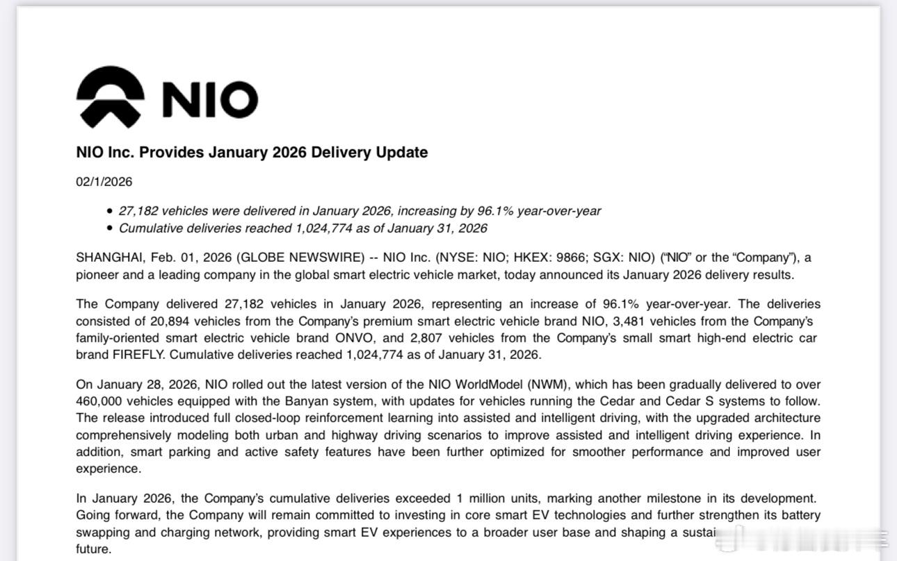 蔚来公司 1 月份交付 27,182 台,当中蔚来品牌交付 20,894 台,全新 ES8 车型交付 17,646 台,历史累计交付为 1,024,774 台。蔚来新能源汽车