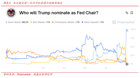 2、本次提名结果是否超预期?博彩网站Polymarket的交易赔率显示,直到2025年12月底,哈塞特获得提名的概率仍保持绝对领先,但沃什的概率在逐步上升。今年1月中旬时,特朗普表示希望将哈塞特留在政府部门,这使得哈塞特获得提名的概率大幅下降,沃什的概率处于绝对领先。但在1月下旬时,由于特朗普称在面试里德尔后对其印象“十分深刻”,一度令里德尔的概率大幅反超沃什。直至本次提名宣布前一天,沃什和里德尔的概率仍相差不大。因此从这个角度来看,本次提名结果仍在相当大程度上令市场感到意外。