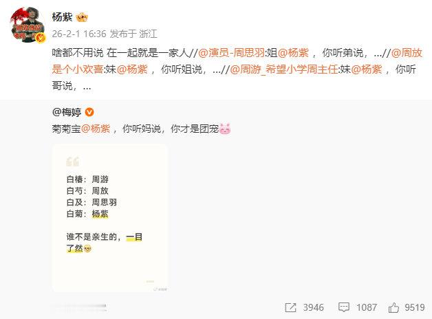 梅婷周放周游周思羽喊话杨紫杨紫回复梅婷周放周游周思羽杨紫回复梅婷周放周游周思羽: 啥都不用说 在一起就是一家人! 白菊不是亲生,一目了然梅婷老师也是冲浪小天才。