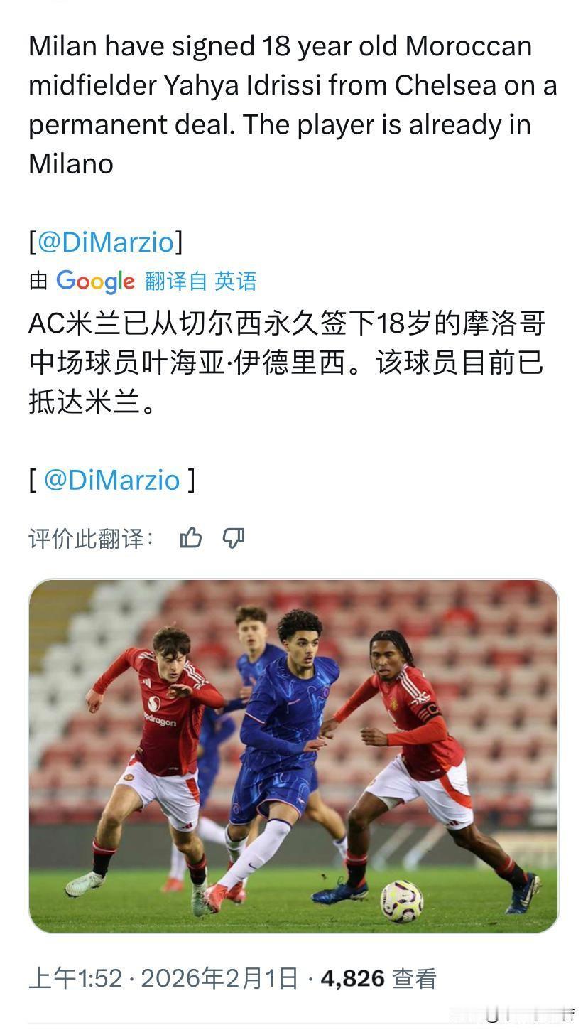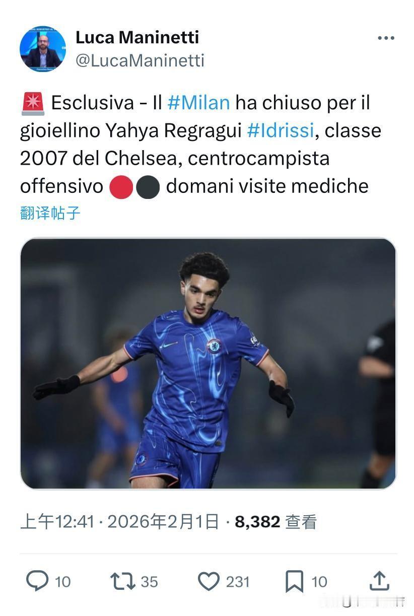 交易完成!米兰已完成对切尔西天才攻击型中场球员叶海亚·雷格拉吉·伊德里西的签约,他出生于2007年,明天将进行体检。这个孩子确实配得上天才,这个伊德里西与易卜拉欣阿巴伊都是来自摩洛哥,他们在切尔西青年队被誉为切尔西双子星,是最被看好的青年队球员。 这是米兰未来储备的第五人,咱们这个冬季窗口已经签约了五名青年球员,叶海亚·雷格拉吉·伊德里西算是咱们买来的五人之中名气比较大的,切尔西为啥会放弃叶海亚·雷格拉吉·伊德里西现在不得而知。 这个孩子与切尔西青年队易卜拉欣阿巴伊,同样是摩洛哥裔,他们被誉为切尔西双子星,当然他们都已经快18岁了,有天赋可天赋并足以打动俱乐部,毕竟巴西那个叫什么旺的孩子已经是主力球员了,这两位摩洛哥的孩子还没有进入过切尔西的一线队。