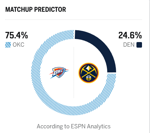 ESPN预测明日比赛:雷霆胜率75.4%,掘金胜率24.6%