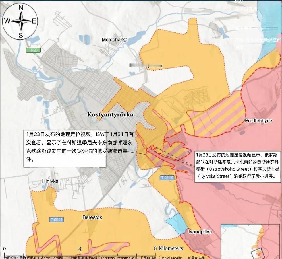 决战双子城之外围争夺:双方在康城均有进展 综合1月30日至31日地理定位视频、双方战报与战场观察员信息,俄军在利曼、斯拉维扬斯克外围实施多点同步突击,康斯坦丁诺夫卡方向俄乌均取得局部战线推进,双方无人装备、精确制导武器与渗透战术全面升级,战场智能化、无人化特征持续凸显。 为应对俄军森林渗透战术,斯拉维扬斯克方向乌军某营发言人披露,乌军放弃常规固定翼与大疆御系列无人机,改用FPV无人机在谢列布良斯克林区执行巡逻任务,精准识别藏匿于林地的俄军渗透小组,提升复杂地形下的早期预警效率。 1月31日的地理定位视频显示,乌军在康斯坦丁诺夫卡西南的亚布留尼夫卡以北区域取得前沿推进,拓展局部控制范围,优化该方向防御纵深与火力观察线。 另一段1月28日地理定位影像显示,俄军在康斯坦丁诺夫卡东南部取得边际性推进,压缩乌军前沿阵地。同日,俄军在康城东南部顿涅茨铁路沿线开展渗透行动。 1月31日,俄罗斯国防部表示,俄军第8合成集团军第20摩步师第10坦克旅攻占康斯坦丁诺夫卡以南的托雷茨克。同时,1月28日影像显示俄军打击亚布留尼夫卡北部乌军阵地,与俄方此前宣称控制该区域的表述存在矛盾。 康斯坦丁诺夫卡方向乌军某旅发言人指出,俄军地面渗透战术效果下降,已调整作战重心,转向制导滑翔弹、身管火炮、无人机协同打击乌军浅近后方后勤节点,同时新增无人机布雷与远程布设雷场作业,针对德鲁日科夫卡区域实施封锁。 乌国防部国防技术顾问、无人机与电子战专家贝斯克列斯特诺夫披露,俄军在康城方向为“闪电”固定翼FPV无人机挂载火箭助推榴弹,提升单兵级精确打击与反装甲能力,俄无人装备弹药适配性持续优化。 面对俄军的进攻,乌军积极反攻。1月30日夜至31日凌晨,乌军持续对康斯坦丁诺夫卡方向俄军浅近后方实施火力反制。乌总参谋部通报,乌军打击德鲁日科夫卡西南波尔塔夫卡附近俄摩步团指挥点,以及康城东北恰索夫亚尔附近俄军兵力集结区,以远程火力削弱俄军指挥效能与突击力量,缓解前沿防御压力。 (本文部分参考战争研究所报告)