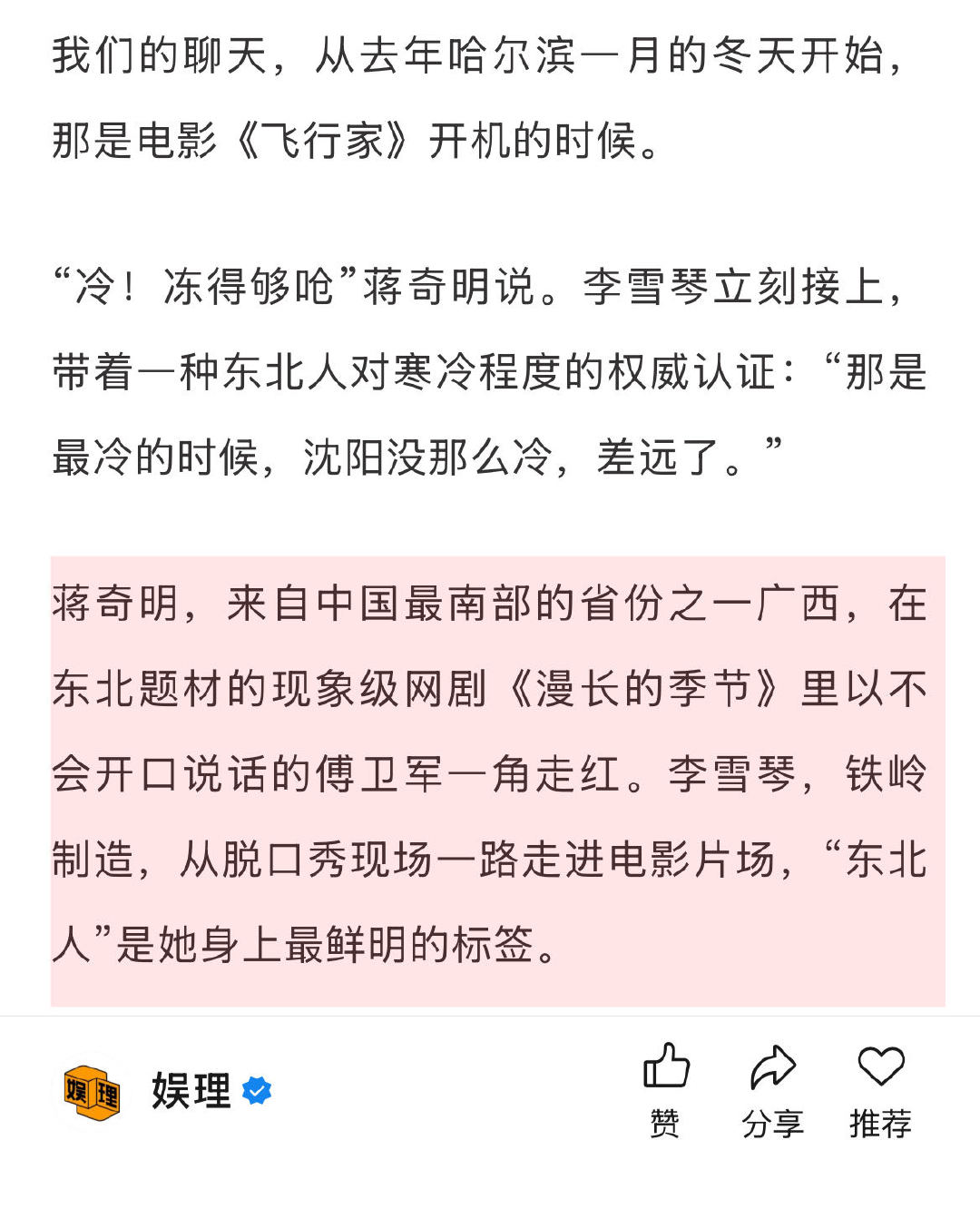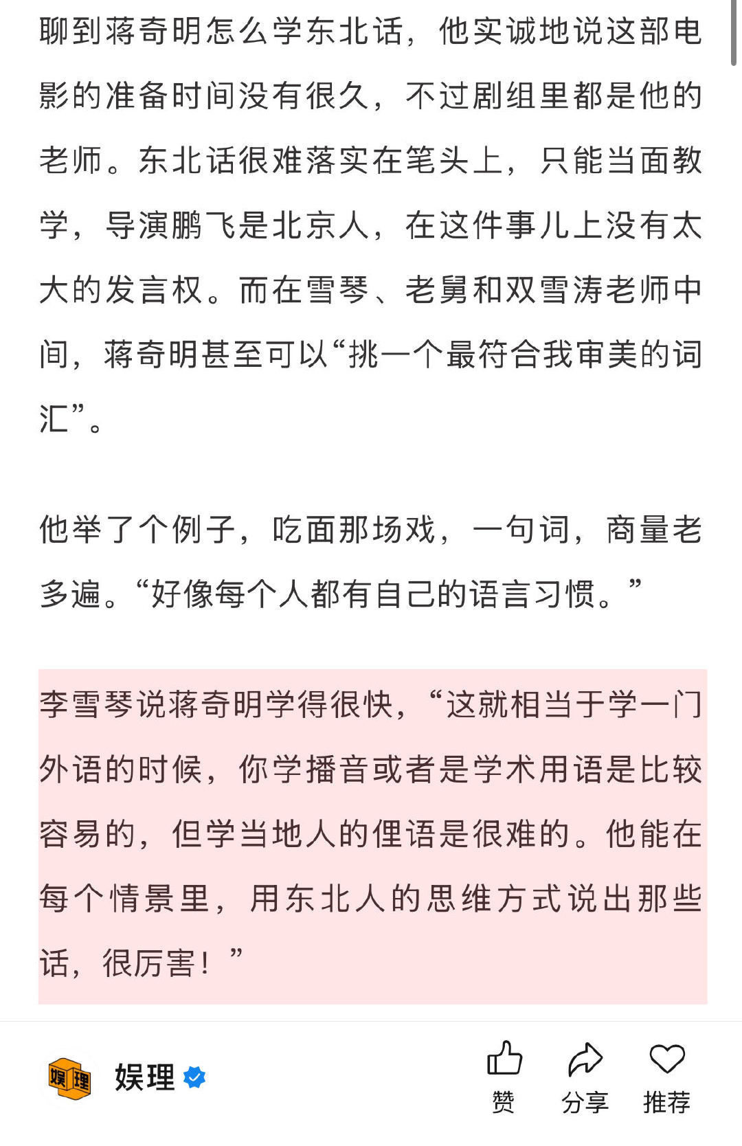 李雪琴谈接综艺和做演员的平衡蒋奇明说不想被小混混角色限制 来自广西,在《漫长的季节》里以傅卫军一角走红。聊到在《飞行家》里怎么学东北话,他说这部电影的准备时间没有很久,不过剧组里都是他的老师。在、老舅和双雪涛中间,蒋奇明甚至可以“挑一个最符合我审美的词汇”。娱理独家↓